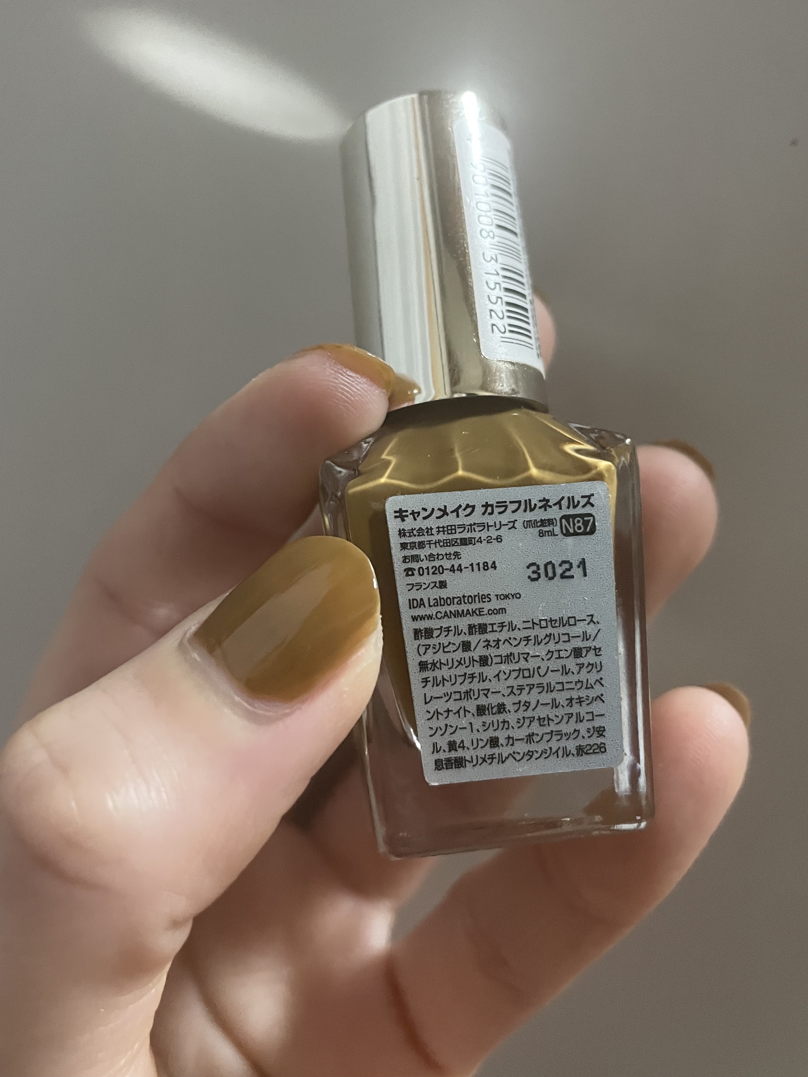 - <N02 シックボルドー> 酢酸ブチル、酢酸エチル、ニトロセルロース、(アジピン酸/ネオペンチルグリコール/無水トリメリト酸)コポリマー、クエン酸アセチルトリブチル、イソプロパノール、アクリレーツコポリマー、ステアラルコニウムベントナイト、酸化鉄、ブタノール、オキシベンゾン-1、シリカ、赤220、ジアセトンアルコール、酸化チタン、リン酸、カーボンブラック、ジ安息香酸トリメチルペンタンジイル、黄4、赤226 [旧]酢酸ブチル、酢酸エチル、ニトロセルロース、(アジピン酸/ネオペンチルグリコール/無水トリメリト酸)コポリマー、クエン酸アセチルトリブチル、イソプロパノール、アクリレーツコポリマー、ステアラルコニウムベントナイト、(スチレン/アクリレーツ)コポリマー、酸化鉄、ブタノール、シリカ、オキシベンゾン-1、赤220、ジアセトンアルコール、酸化チタン、ジ安息香酸トリメチルペンタンジイル、リン酸、カーボンブラック、黄4 <N08 ミスティモーヴ> 酢酸ブチル、酢酸エチル、ニトロセルロース、(アジピン酸/ネオペンチルグリコール/無水トリメリト酸)コポリマー、クエン酸アセチルトリブチル、イソプロパノール、アクリレーツコポリマー、ステアラルコニウムベントナイト、酸化チタン、ブタノール、シリカ、オキシベンゾン-1、マンガンバイオレット、ジアセトンアルコール、酸化鉄、赤226、リン酸、カオリン、ジ安息香酸トリメチルペンタンジイル、黄4 [旧] 酢酸ブチル、酢酸エチル、ニトロセルロース、(アジピン酸/ネオペンチルグリコール/無水トリメリト酸)コポリマー、クエン酸アセチルトリブチル、イソプロパノール、アクリレーツコポリマー、ステアラルコニウムベントナイト、(スチレン/アクリレーツ)コポリマー、酸化チタン、ブタノール、オキシベンゾン-1、シリカ、酸化鉄、ジアセトンアルコール、マンガンバイオレット、ジ安息香酸トリメチルペンタンジイル、リン酸、カーボンブラック、黄4 <N10 ペールラベンダー> 酢酸ブチル、酢酸エチル、ニトロセルロース、(アジピン酸/ネオペンチルグリコール/無水トリメリト酸)コポリマー、クエン酸アセチルトリブチル、イソプロパノール、アクリレーツコポリマー、ステアラルコニウムベントナイト、酸化チタン、ブタノール、酸化鉄、オキシベンゾン-1、シリカ、ジアセトンアルコール、マンガンバイオレット、リン酸、ジ安息香酸トリメチルペンタンジイル、黄4、赤226 [旧]酢酸ブチル、酢酸エチル、ニトロセルロース、(アジピン酸/ネオペンチルグリコール/無水トリメリト酸)コポリマー、クエン酸アセチルトリブチル、イソプロパノール、アクリレーツコポリマー、ステアラルコニウムベントナイト、酸化チタン、ブタノール、シリカ、オキシベンゾン-1、ジアセトンアルコール、酸化鉄、ジ安息香酸トリメチルペンタンジイル、マンガンバイオレット、リン酸、黄4 <N12 アーモンドグリーン> 酢酸ブチル、酢酸エチル、ニトロセルロース、(アジピン酸/ネオペンチルグリコール/無水トリメリト酸)コポリマー、クエン酸アセチルトリブチル、イソプロパノール、アクリレーツコポリマー、ステアラルコニウムベントナイト、(スチレン/アクリレーツ)コポリマー、酸化チタン、ブタノール、シリカ、オキシベンゾン-1、ジアセトンアルコール、ジ安息香酸トリメチルペンタンジイル、黄4、カーボンブラック、リン酸、コンジョウ <N16 ココア> 酢酸ブチル、酢酸エチル、ニトロセルロース、(アジピン酸/ネオペンチルグリコール/無水トリメリト酸)コポリマー、クエン酸アセチルトリブチル、イソプロパノール、酸化チタン、アクリレーツコポリマー、ステアラルコニウムベントナイト、酸化鉄、ブタノール、シリカ、オキシベンゾン-1、ジアセトンアルコール、黄4、リン酸、ジ安息香酸トリメチルペンタンジイル、カーボンブラック、赤226 [旧]酢酸ブチル、酢酸エチル、ニトロセルロース、(アジピン酸/ネオペンチルグリコール/無水トリメリト酸)コポリマー、クエン酸アセチルトリブチル、イソプロパノール、酸化チタン、アクリレーツコポリマー、ステアラルコニウムベントナイト、ブタノール、酸化鉄、シリカ、オキシベンゾン-1、ジアセトンアルコール、ジ安息香酸トリメチルペンタンジイル、黄4、リン酸、カーボンブラック <N17 クリームチャイ> 酢酸ブチル、酢酸エチル、ニトロセルロース、(アジピン酸/ネオペンチルグリコール/無水トリメリト酸)コポリマー、クエン酸アセチルトリブチル、イソプロパノール、アクリレーツコポリマー、ステアラルコニウムベントナイト、(スチレン/アクリレーツ)コポリマー、酸化チタン、ブタノール、シリカ、オキシベンゾン-1、ジアセトンアルコール、ジ安息香酸トリメチルペンタンジイル、酸化鉄、リン酸、黄4、カーボンブラック <N19 スウィートコーラル> 酢酸ブチル、酢酸エチル、ニトロセルロース、(アジピン酸/ネオペンチルグリコール/無水トリメリト酸)コポリマー、クエン酸アセチ