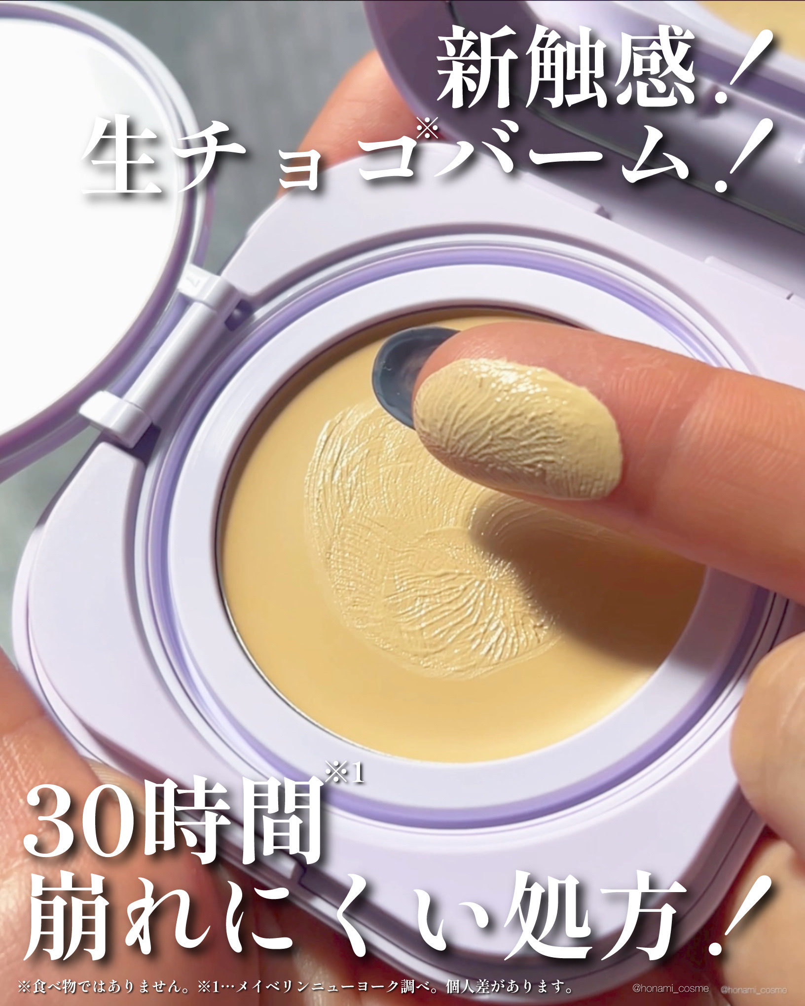 新感覚💖生チョコ感覚バームのファンデーション🥰 重ね塗りしても厚塗り感がなく、自然に仕上がってすごく気に入りました❣️ 日本人が使いやすい4色展開です💫 バームを3-4回優しくタップして肌にポンポンなじませて使用してね🎶 更に気になるところには重ね塗りもOK💗