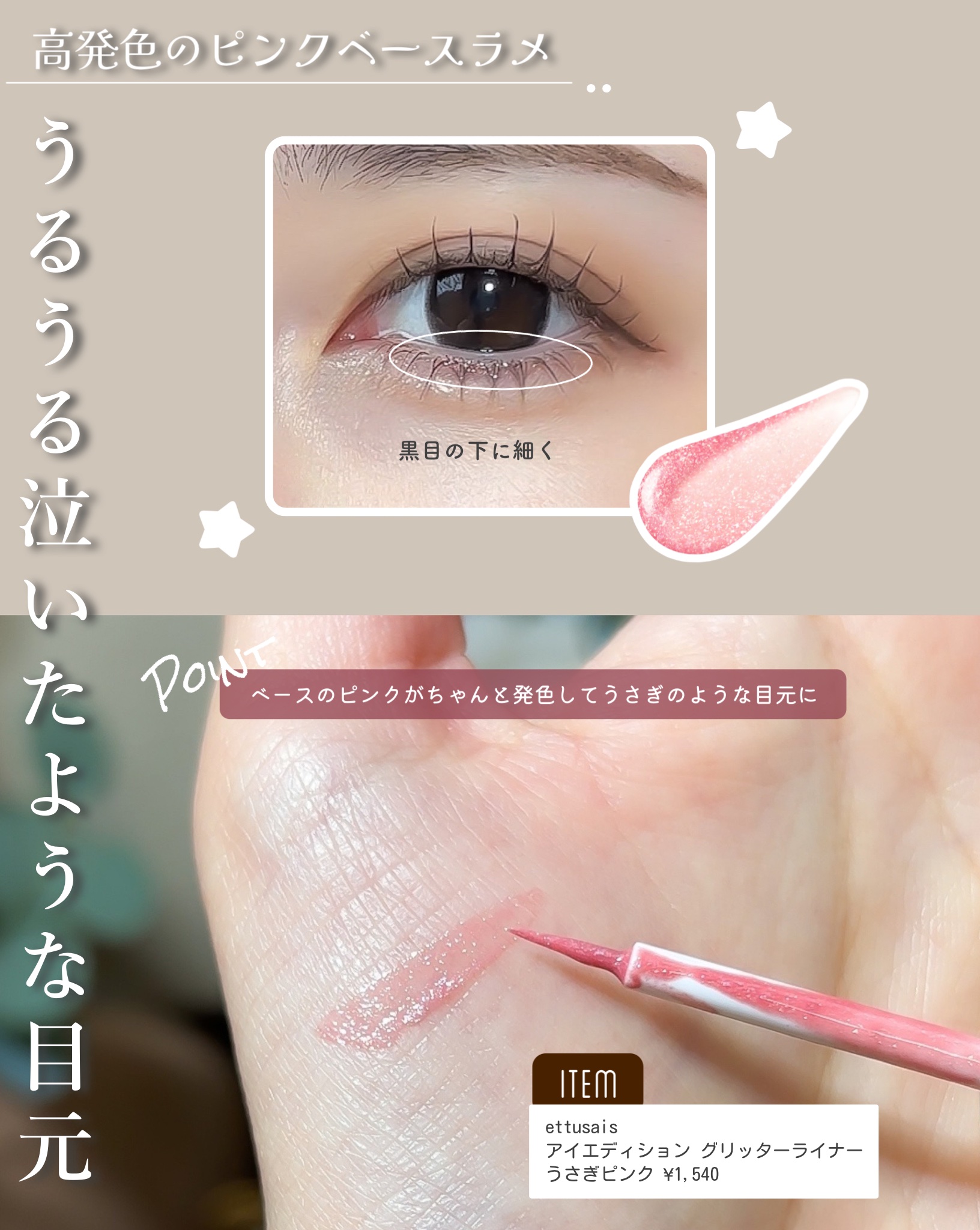 ettusaisエテュセアイエディショングリッターライナーうさぎピンク血色ピンク×繊細パールの透明感まるで泣いているようなうるっとした瞳をつくる涙袋グリッター血色ピンクのベース×繊細に輝く涙色パールがうるっとした血色感のある目元に見せてくれま...