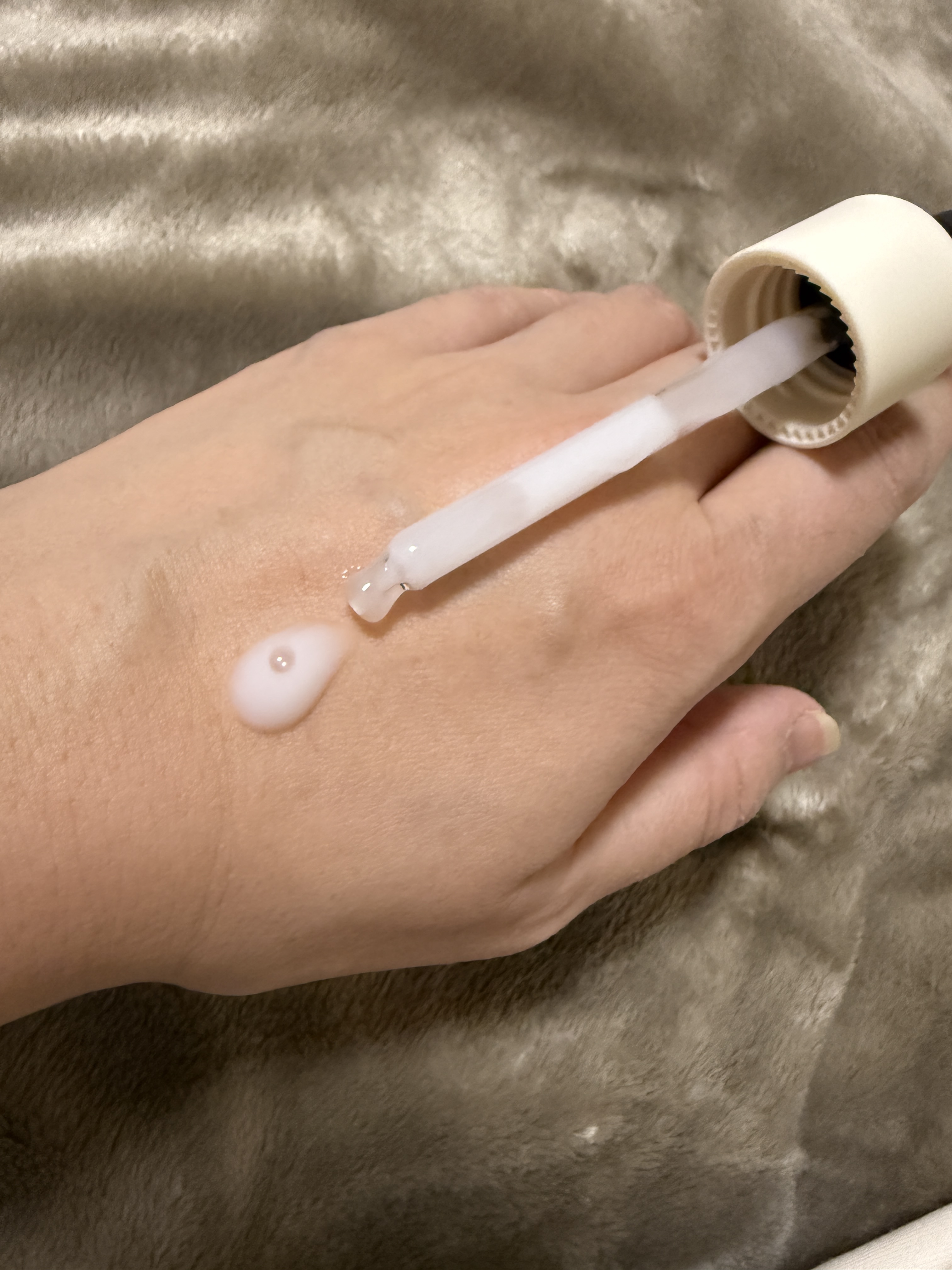 洗顔後、化粧水をつけた後に使用しています。ガラスの瓶に入っており、蓋はスポイドタイプ。サラサラとしたテクスチャーの液体で、私は毎回5滴がちょうどいい量です。スポイド部分が長めなので、使いたい量を一度で吸い上げられるのが助かります。両掌で顔全体...