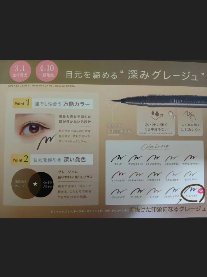 ベスコス受賞アイライナーから新色が仲間入り🆕´-D-UPシルキーリキッドアイライナーWP新色の《チャコールモカ》は黄みと赤みを抑えた顔が浮かない色設計✨️グレージュに使いやすい黒をプラスし、強さではなく深みで締めるこだわりの発色❣️アイライナ...