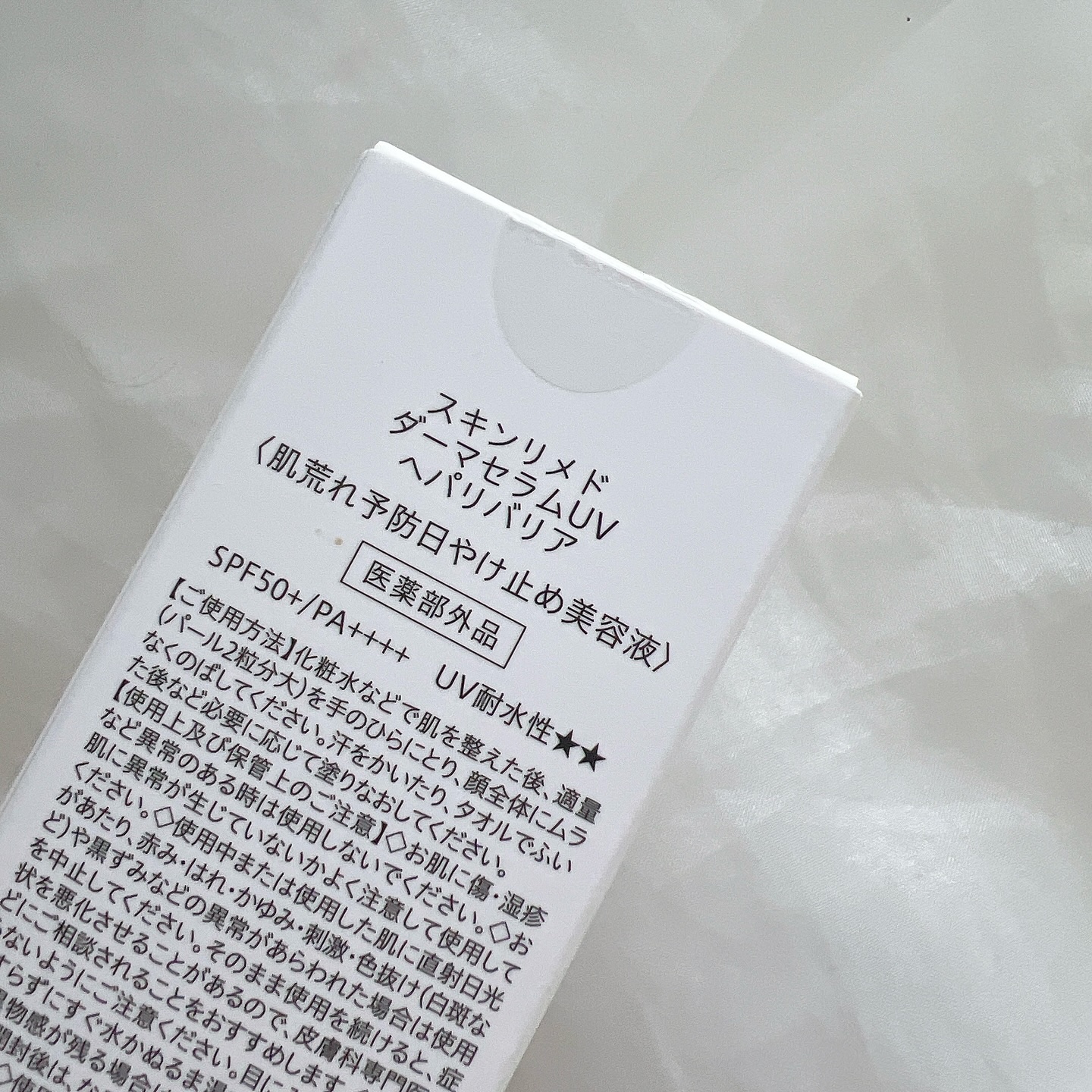 - 【医薬部外品】 紫外線をブロックしながら、肌荒れも防ぎ、日中の潤い守る日焼け止め美容クリーム SKN REMED 薬用ダーマセラムUV ヘパリバリア SPF50+ PA++++ UV耐水性★★ 1. 肌の潤いを高めて肌あれを防ぎ、健やかなツヤ肌へ W有効成分【ヘパリン類似物質×グリチルリチン酸ジカリウム】 2. 潤いを抱え込むバリアサポート成分【2種類のセラミド・ヒアルロン酸・ツボクサエキス※1】 3. 肌に潤い与えキメを整えいきいきとした明るい肌印象へ導く、浸透性※3・持続性に優れたビタミンC誘導体【VCエチル※2】 4. 使いやすく、肌を紫外線からしっかり守る高スペック 紫外線をしっかりブロックSPF50+ PA++++ UV耐水性★★(ウォータープルーフ) 化粧下地にも使える・せっけんオフOK・ノンケミカル処方/紫外線吸収剤フリー パラベン、アルコール、鉱物油、合成着色料、合成香料フリー ※1 N-ステアロイルフィトスフィンゴシン、ヒドロキシステアリルフィトスフィンゴシン、 ヒアルロン酸ナトリウム(2) ツボクサエキス(すべて保湿成分) ※2 3-O-エチルアスコルビン酸(整肌成分)※3 角層まで