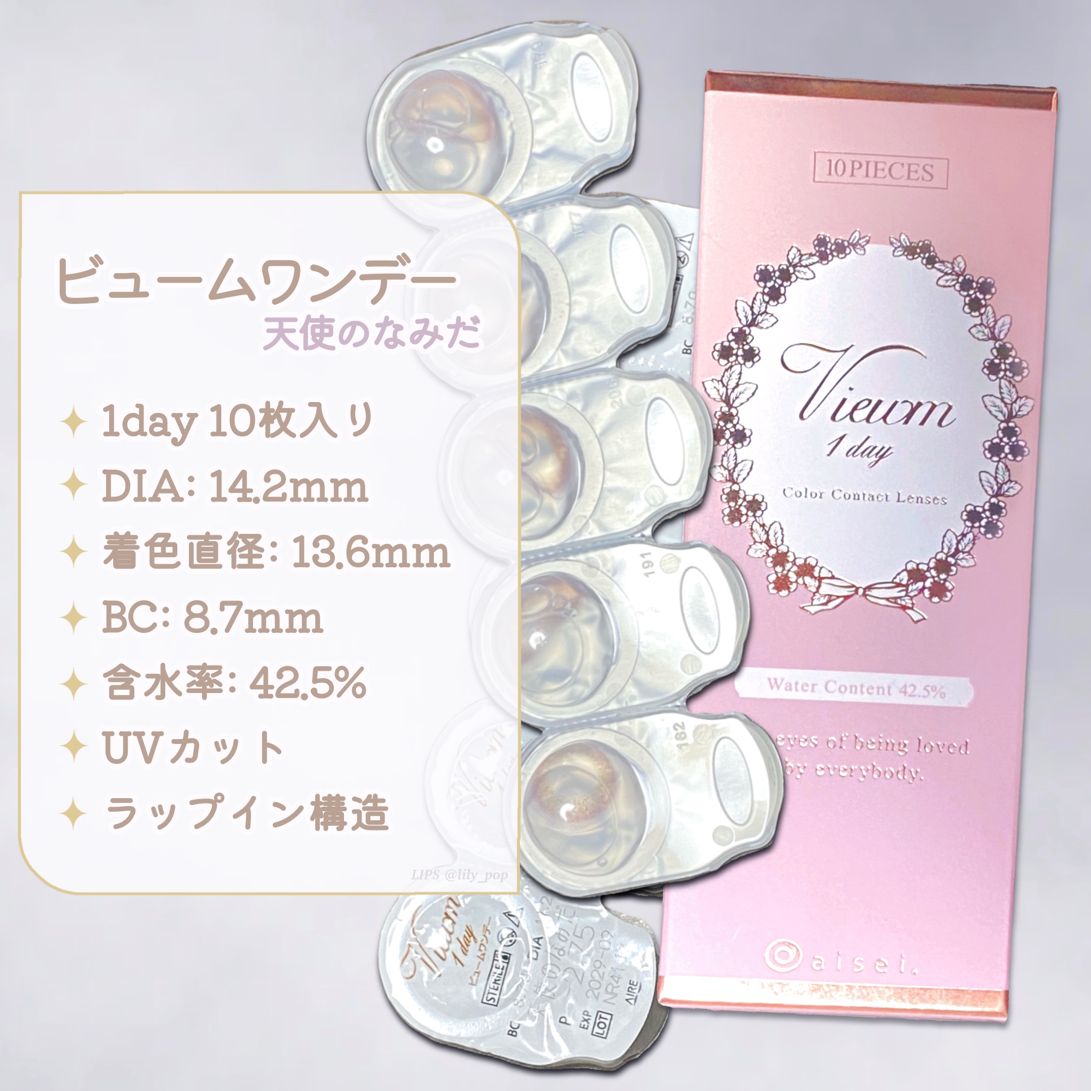紫が強いピンクって感じです。ほんのり色付くのでナチュラルに儚い目になります。 UVカットなのも嬉しい〜 一日つけていてもゴロゴロしないので使いやすかったです。 10枚入・ワンデー DIA:14.0mm 着色直径:13.0mm BC:8.7mm 含水率:55%