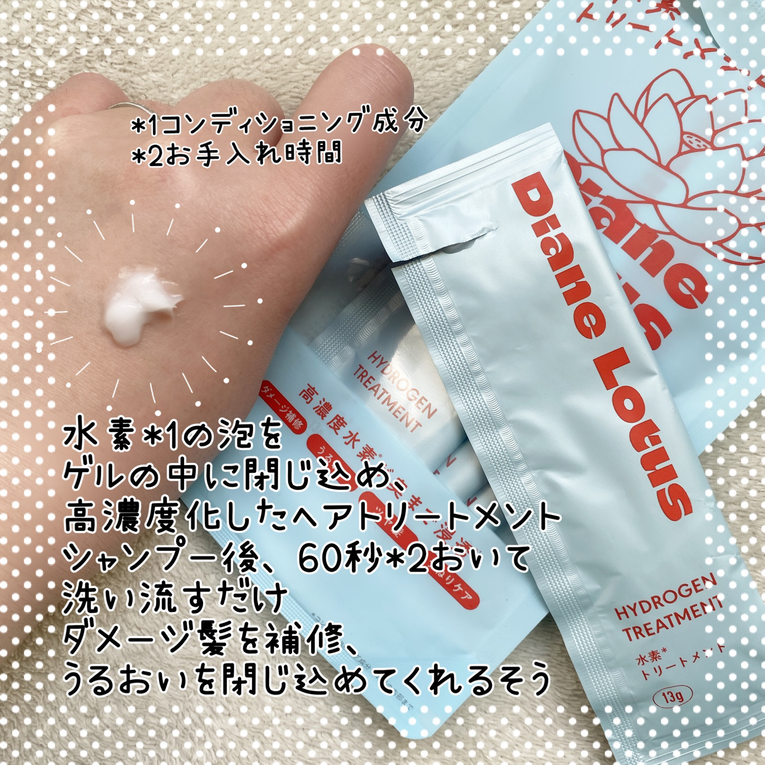 DianeLotus水素トリートメントダメージ補修&たっぷり潤い。水素(*1)の泡をゲルの中に閉じ込めて高濃度化したヘアトリートメント。 ケラチン(*2)とアルガンオイル(*3)を配合し、ダメージ髪を補修。 簡単60秒(*4)のトリートメント...