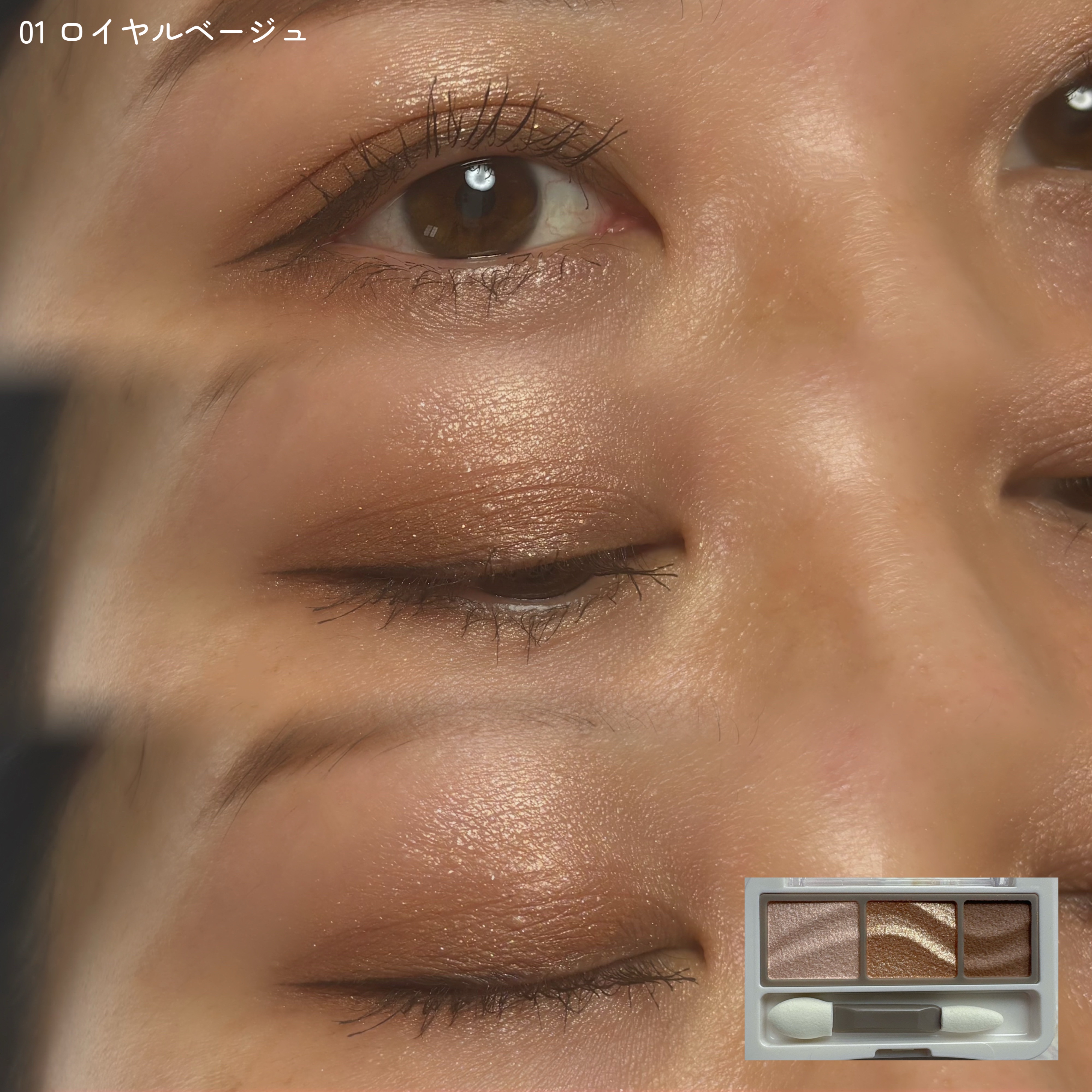 - 簡単に繊細グラデが作れる透けうる3色アイシャドウ。 使い方に迷わない!3色を重ねるだけで作りこんだような繊細グラデーションが完成。うるっと透け感×高発色で自然にくっきりとした目元に。 光を散乱させてくすみを払うソフトフォーカス効果パウダーを高配合。くすみにくく透き通るような明るい仕上がり。 しっとりとしたオイルコーティング処方で、ピタッと密着してヨレにくい。 ダブルエンドチップ付き。 01 ロイヤルベージュ:ベーシックに使いやすいブラウンベージュ。 02 ペタルピンク:ふんわり血色感をまとうライラックピンク。