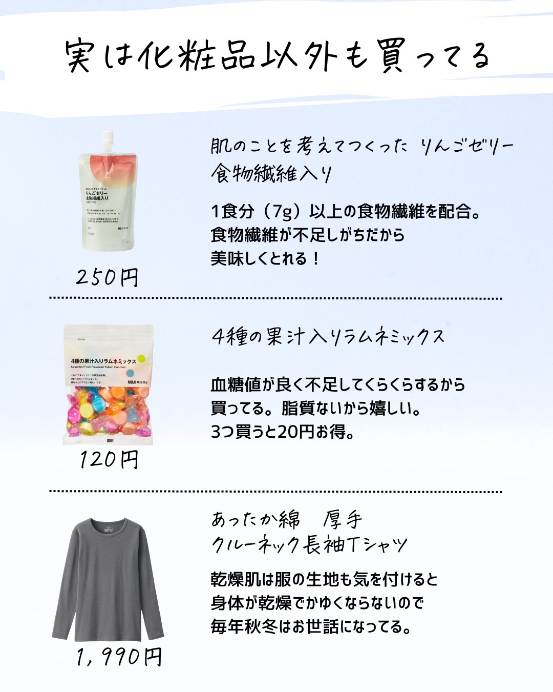 特定の有効成分を試してみたい。美容成分を試したい。そんな時は代用してもいいけど、それって似てるのかな?って思うときが正直ある。 同じ成分があっても実は濃度が違ったり、処方技術が違ったり。技術が違うと使用感も剤型も変わることがあることは知ったうえで使うといいかも。 せっかくプチプラ化粧品を買うならそれはそれで楽しんでほしいから是非念頭にいれてほしいな!!
