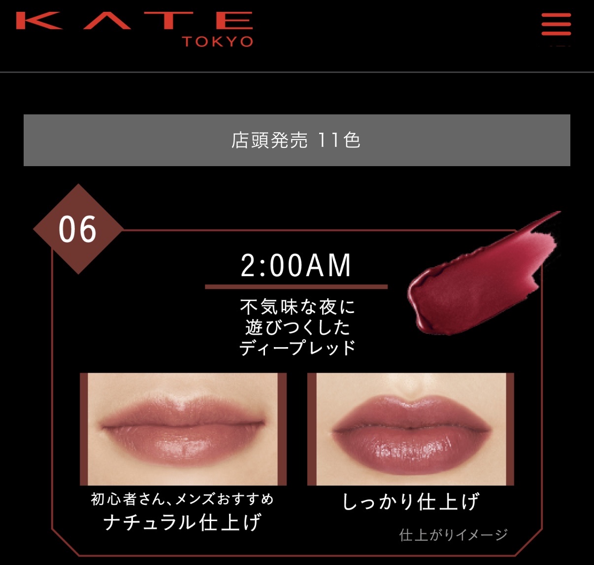 - <01 欲望の塊> テトライソステアリン酸ジペンタエリスリチル、トリ(カプリル酸/カプリン酸)グリセリル、オクチルドデカノール、ラウロイルグルタミン酸ジ(フィトステリル/オクチルドデシル)、ビスアルキル(C16-18)グリセリルウンデシルジメチコン、イソノナン酸イソトリデシル、水添ポリイソブテン、ラウロイルグルタミン酸ジ(オクチルドデシル/フィトステリル/ベヘニル)、パラフィン、合成ワックス、ダイマージリノール酸(フィトステリル/イソステアリル/セチル/ステアリル/ベヘニル)、マイクロクリスタリンワックス、水添マイクロクリスタリンワックス、ヒドロキシステアリン酸エチルヘキシル、トコフェロール、ホホバ種子油、オリーブ果実油、アーモンド油、(エチレン/プロピレン)コポリマー、ポリエチレン、ジメチコン、(+/-)(チタン/酸化チタン)焼結物、マイカ、ラウロイルアスパラギン酸Na、ラウロイルリシン、塩化亜鉛、酸化チタン、酸化鉄、水酸化Al、硫酸Ba、トリイソステアリン酸イソプロピルチタン、酸化スズ、ホウケイ酸(Ca/Al)、合成フルオロフロゴパイト、黄4、黄5、赤104(1)、赤201、赤202 <02 ピンクバナナ> テトライソステアリン酸ジペンタエリスリチル、トリ(カプリル酸/カプリン酸)グリセリル、オクチルドデカノール、ラウロイルグルタミン酸ジ(フィトステリル/オクチルドデシル)、ビスアルキル(C16-18)グリセリルウンデシルジメチコン、イソノナン酸イソトリデシル、水添ポリイソブテン、ラウロイルグルタミン酸ジ(オクチルドデシル/フィトステリル/ベヘニル)、パラフィン、合成ワックス、ダイマージリノール酸(フィトステリル/イソステアリル/セチル/ステアリル/ベヘニル)、マイクロクリスタリンワックス、水添マイクロクリスタリンワックス、ヒドロキシステアリン酸エチルヘキシル、トコフェロール、ホホバ種子油、オリーブ果実油、アーモンド油、(エチレン/プロピレン)コポリマー、ポリエチレン、ジメチコン、(+/-)(チタン/酸化チタン)焼結物、マイカ、ラウロイルアスパラギン酸Na、ラウロイルリシン、塩化亜鉛、酸化チタン、酸化鉄、水酸化Al、硫酸Ba、トリイソステアリン酸イソプロピルチタン、酸化スズ、ホウケイ酸(Ca/Al)、合成フルオロフロゴパイト、黄4、黄5、赤104(1)、赤201、赤202 <03 陽炎> テトライソステアリン酸ジペンタエリスリチル、トリ(カプリル酸/カプリン酸)グリセリル、オクチルドデカノール、ラウロイルグルタミン酸ジ(フィトステリル/オクチルドデシル)、ビスアルキル(C16-18)グリセリルウンデシルジメチコン、イソノナン酸イソトリデシル、水添ポリイソブテン、ラウロイルグルタミン酸ジ(オクチルドデシル/フィトステリル/ベヘニル)、パラフィン、合成ワックス、ダイマージリノール酸(フィトステリル/イソステアリル/セチル/ステアリル/ベヘニル)、マイクロクリスタリンワックス、水添マイクロクリスタリンワックス、ヒドロキシステアリン酸エチルヘキシル、トコフェロール、ホホバ種子油、オリーブ果実油、アーモンド油、(エチレン/プロピレン)コポリマー、ポリエチレン、ジメチコン、(+/-)(チタン/酸化チタン)焼結物、マイカ、ラウロイルアスパラギン酸Na、ラウロイルリシン、塩化亜鉛、酸化チタン、酸化鉄、水酸化Al、硫酸Ba、トリイソステアリン酸イソプロピルチタン、酸化スズ、ホウケイ酸(Ca/Al)、合成フルオロフロゴパイト、黄4、黄5、赤104(1)、赤201、赤202 <04 パンプキンワイン> テトライソステアリン酸ジペンタエリスリチル、トリ(カプリル酸/カプリン酸)グリセリル、オクチルドデカノール、ラウロイルグルタミン酸ジ(フィトステリル/オクチルドデシル)、ビスアルキル(C16-18)グリセリルウンデシルジメチコン、イソノナン酸イソトリデシル、水添ポリイソブテン、ラウロイルグルタミン酸ジ(オクチルドデシル/フィトステリル/ベヘニル)、パラフィン、合成ワックス、ダイマージリノール酸(フィトステリル/イソステアリル/セチル/ステアリル/ベヘニル)、マイクロクリスタリンワックス、水添マイクロクリスタリンワックス、ヒドロキシステアリン酸エチルヘキシル、トコフェロール、ホホバ種子油、オリーブ果実油、アーモンド油、(エチレン/プロピレン)コポリマー、ポリエチレン、ジメチコン、(+/-)(チタン/酸化チタン)焼結物、マイカ、ラウロイルアスパラギン酸Na、ラウロイルリシン、塩化亜鉛、酸化チタン、酸化鉄、水酸化Al、硫酸Ba、トリイソステアリン酸イソプロピルチタン、酸化スズ、ホウケイ酸(Ca/Al)、合成フルオロフロゴパイト、黄4、黄5、赤104(1)、赤201、赤202 <05 ダークフィグ> テトライソステアリン酸ジペンタエリスリチル、トリ(カプリル酸/カプリン酸)グリセリル、オクチルドデカノール、ラウロイルグルタミン酸ジ(フィトステリル/オクチルドデシル)、ビスアルキル(C16-18)グリセリルウンデシルジメチコン、イソノナン酸イソトリデシル、水添ポリイソブテン、ラウロイルグルタミン酸ジ(オクチルドデシル/フィトステリル/ベヘニル)、
