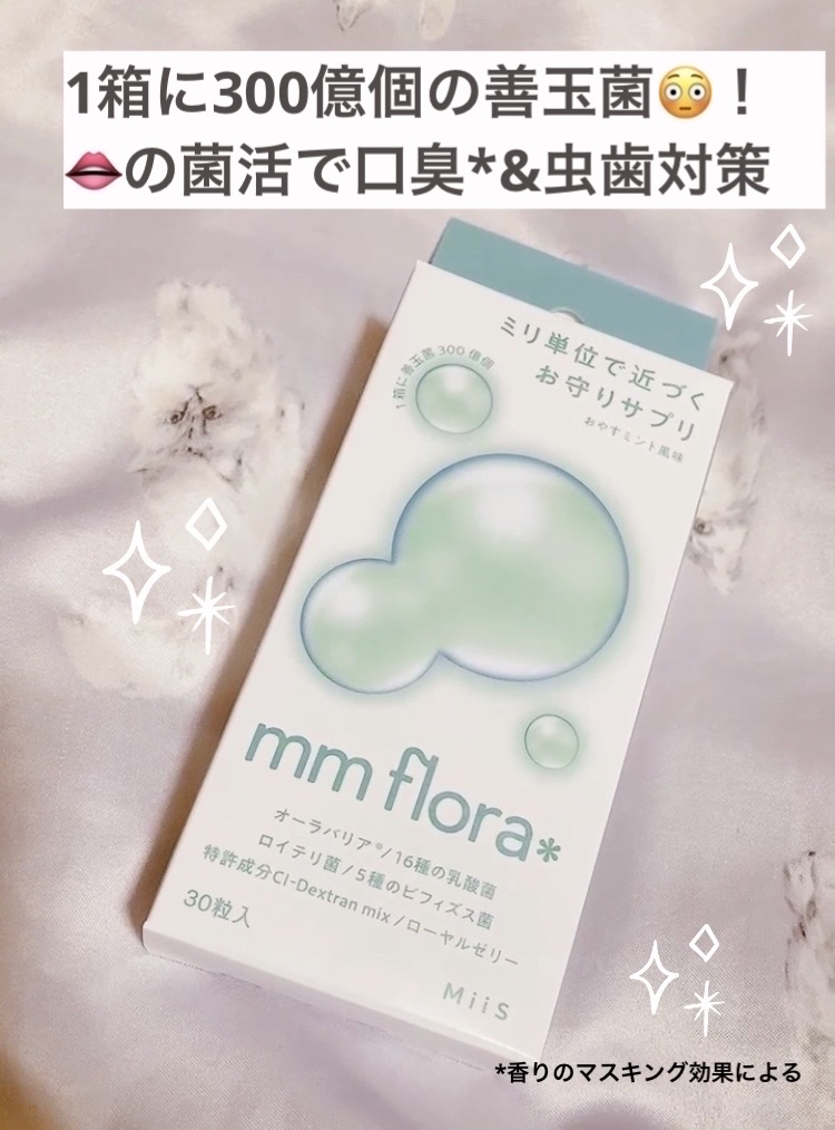 .mmflora(エムエムフローラ) 「おやすミント風味」\口腔ケアタブレット🫦/1箱に300億個の善玉菌を配合!“口内フローラ”に着目し、1ミリでも近くで人とお話するためのお守りになるようにという想いが込められているよ😊🫶臭いはなく、丸くて...