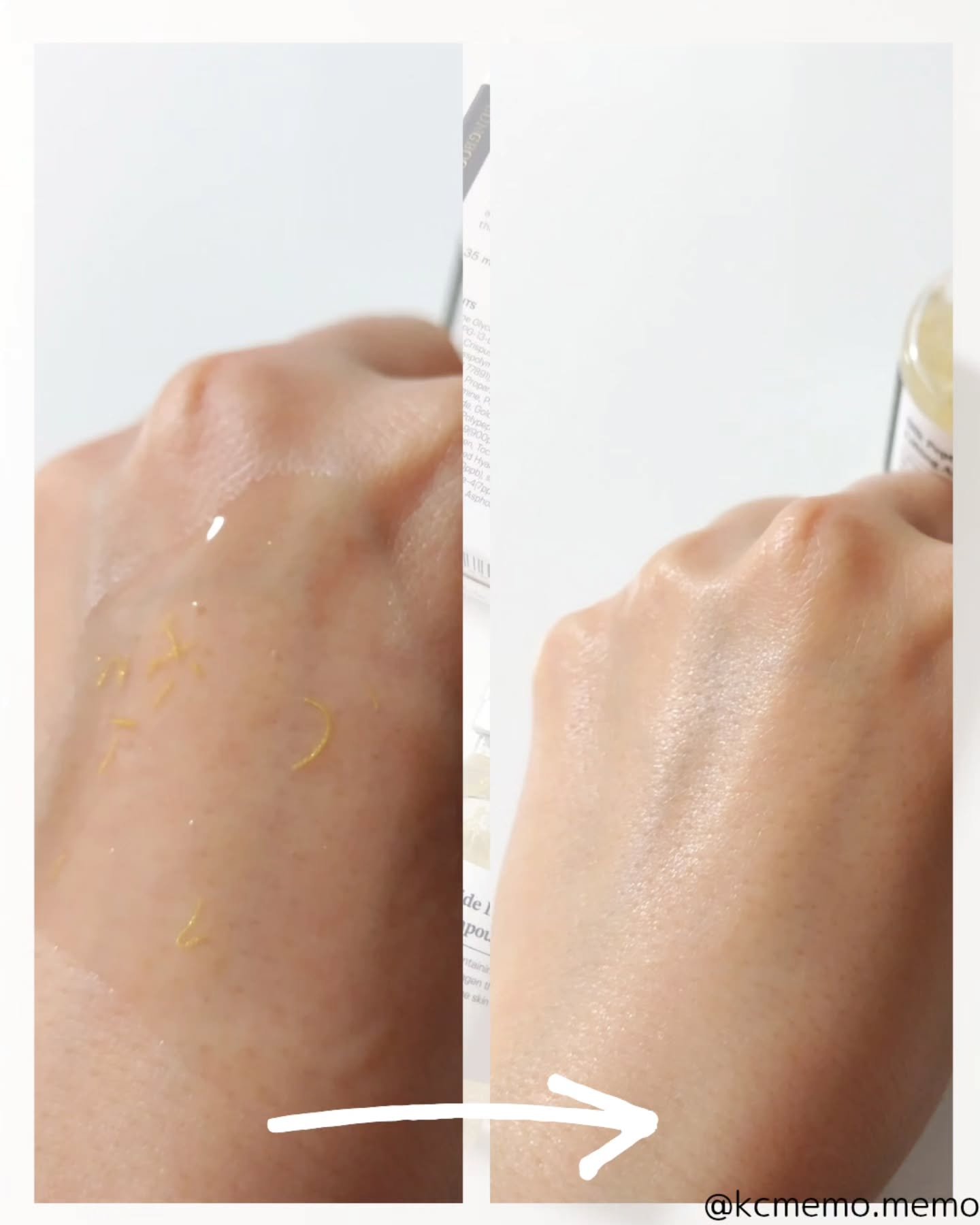 - <35mL> 水、BG、グリセリン、メチルプロパンジオール、1,2-ヘキサンジオール、ナイアシンアミド、カルボマー、トロメタン、PPG-13デシルテトラデセス-24、ヒドロキシエチルセルロース、シルクエキス、アデノシン、トチャカ、カンテン、エチルヘキシルグリセリン、EDTA-2Na、(アクリルレート/アクリル酸アルキル(C10-30))クロスポリマー、合成フルオトフロゴバイト、ベタイン、パンテノール、加水分解エラスチン、酸化チタン、赤色酸化鉄、マイカ、ジェランガム、加水分解コラーゲンエキス、ツボクサエキス、プロパンジオール、リン酸アスコルビルMg、ドクダミエキス、レシチン、アセチルグルタミン、フェノキシエタノール、カワラヨモギエキス、ヒアルロン酸Na、カプリリルグリコール、酸化スズ、金、スクワラン、水添ポリイソブテン、ベンジルグリコール、合成ヒト遺伝子組換オリゴペプチド-1、合成ヒト遺伝子組換ポリペプチド-1、合成ヒト遺伝子組換オリゴペプチド-2、合成ヒト遺伝子組換ポリペプチド-11、合成ヒト遺伝子組換オリゴペプチド-9、加水分解ムコ多糖、コラーゲン、トコフェロール、ヒアルロン酸クロスポリマーNa、加水分解ヒアルロン酸、合成ヒト遺伝子組換デカペプチド-7、合成ヒトオクタペプチド-4、合成ヒトペンタペプチド-19、ヒアルロン酸ヒドロキシプロピルトリモニウム、バルミトイルペンタペプチド-4、アセチルヘキサペプチド-8、トリペプチド-1、銅、ヒアルロン酸、ハナスゲ根エキス、アセチルヒアルロン酸Na、ラズベリーケトン