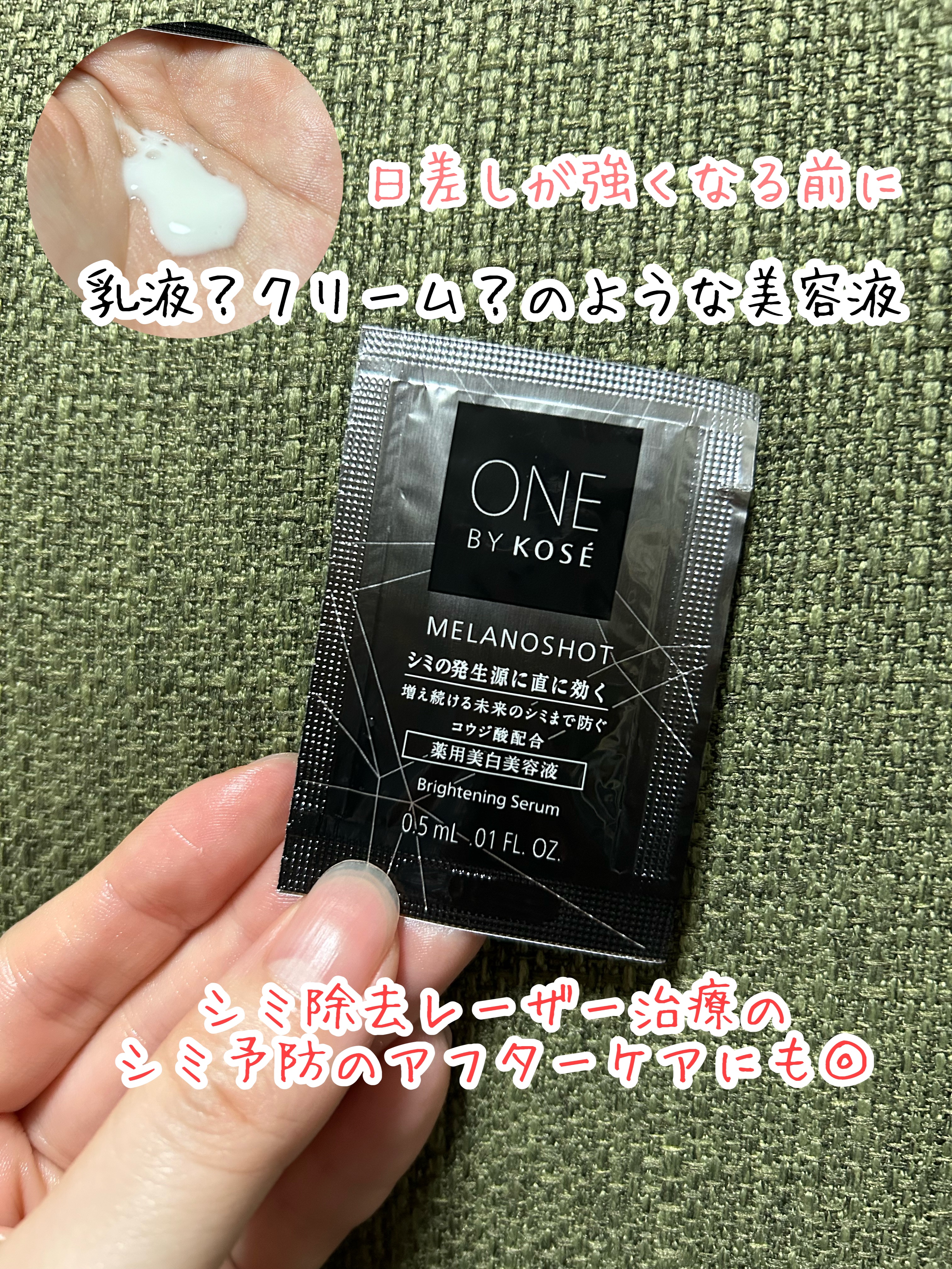 シミ発生源に直に効く 天然由来の美白有効成分 進化したみずみずしい浸透感 ワンバイコーセー メラノショット Wには美白有効成分の「コウジ酸」含まれている ほんの〜りとお上品で素敵な香り ほんのりオレンジ味のあるとろっとしたテクスチャーで、肌馴染みも良くていいです。