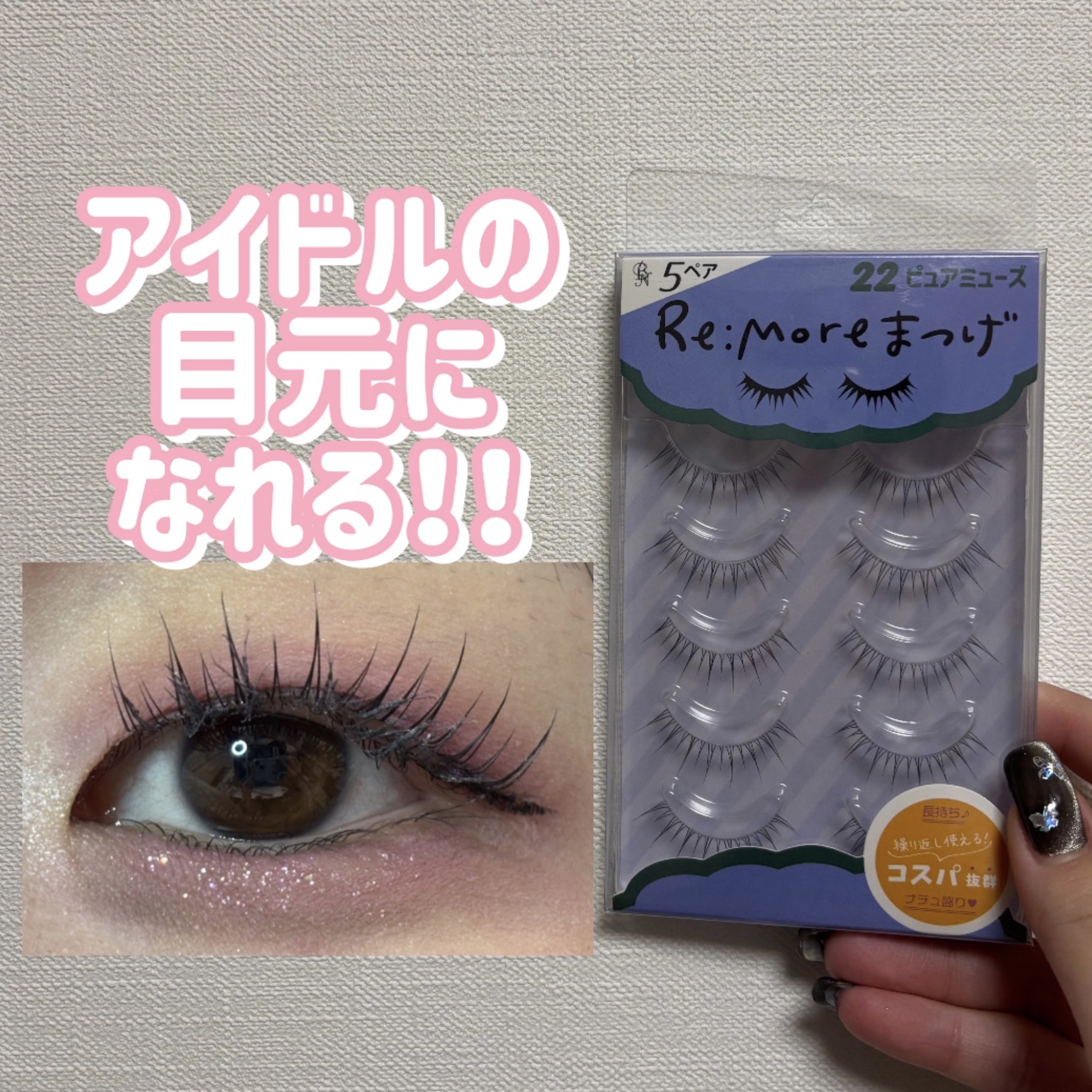 束感アイドルつけま Re:Moreまつげで時短アイメイク💜 繰り返しっかえる!コスパ抜群のつけまつげ♥ 束感があって自まつげに馴染む感じが良かったよ! 芯の部分が柔らかいのも良かったの横から見た感じも自然だからぜひ試してほしい!!