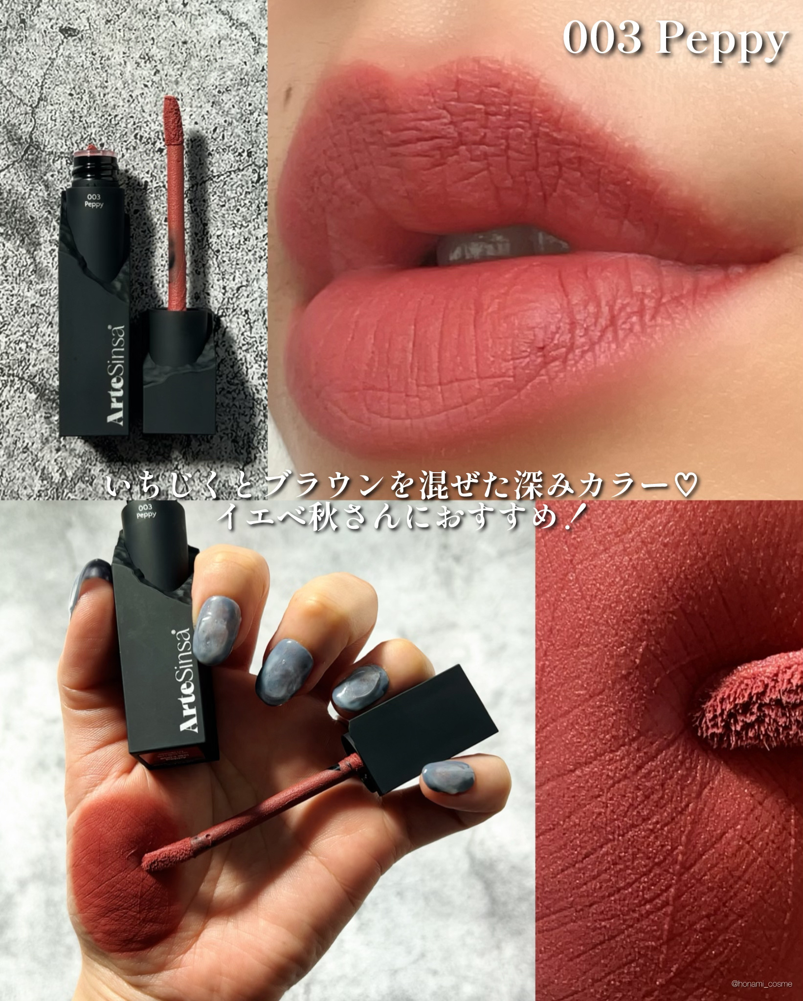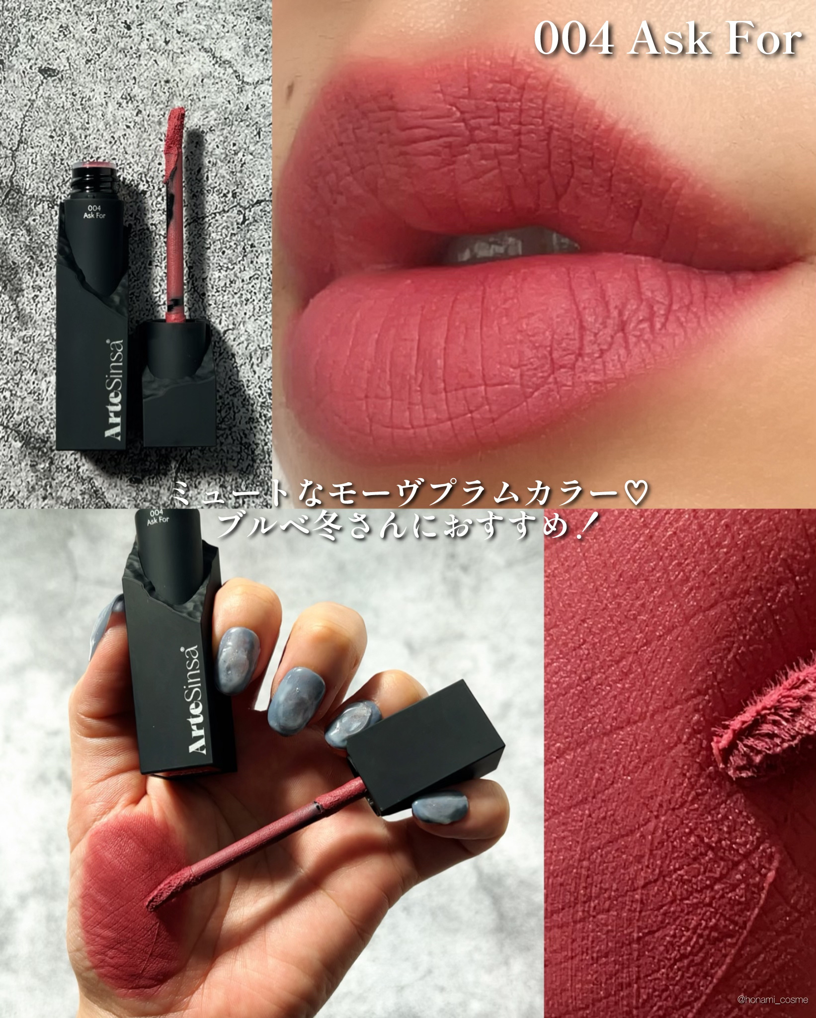 - 【Silky Blur Tint 】は「彫刻ティント」で話題となったArteSinsa初のマットティントです。 ムースのように軽やかに馴染み、なめらかにブラーリングされる軽めのテクスチャーで、長持ちする着色力と高い保湿力を兼ね備え、唇に優しい使い心地で使用でき密着力も◎!