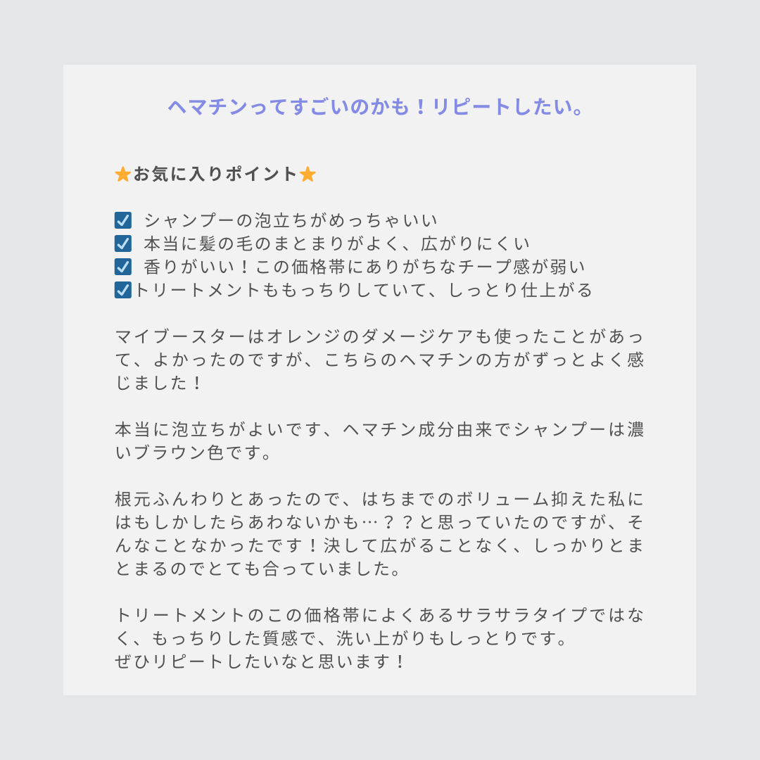 マイブースターズヘマチンシャンプー&トリートメント注目成分「ヘマチン※1」配合のシャンプー&トリートメントヘマチンにはダメージ補修やカラーケア根元ふんわり毛先まとまる嬉しい効果がたくさん!シャンプーが茶色くてびっくり!泡立ちすごくよ...