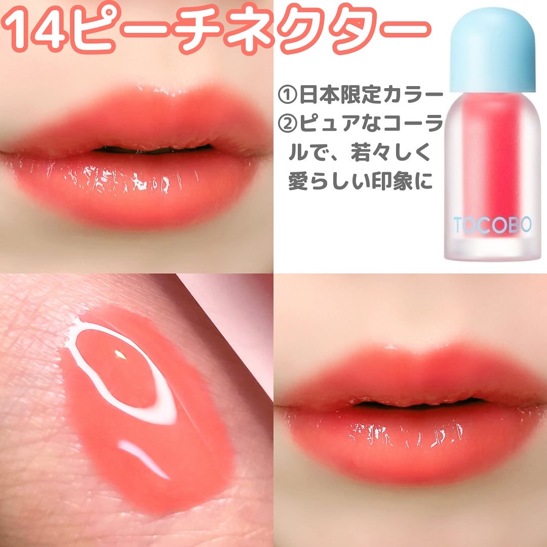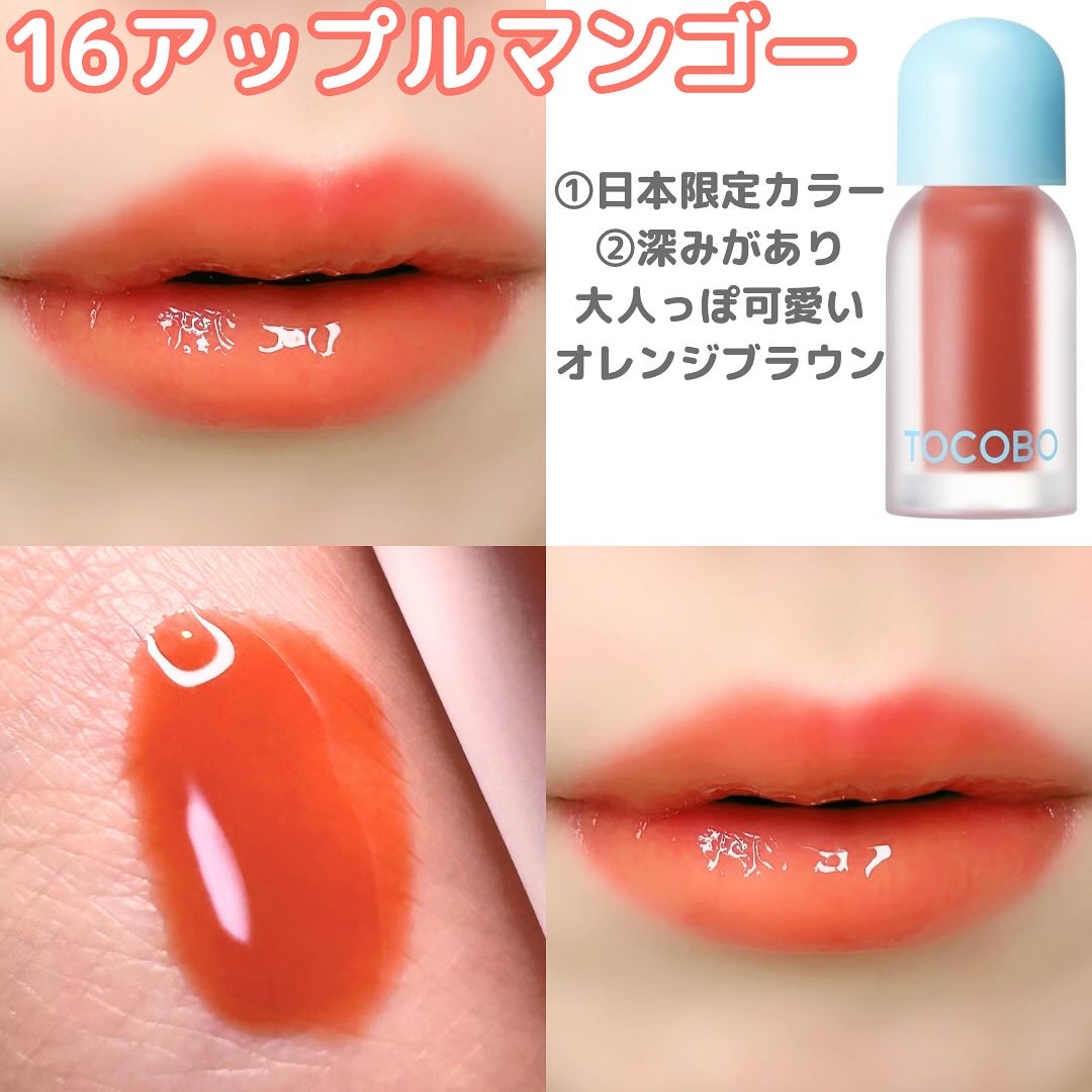 ガラスのようなツヤ&ボリュームのある唇に仕上げてくれるトコボのリップオイル✨️今回いただいた11、12、14、16のうち14と16は日本限定カラー🎀11はプランピング効果2倍で結構痛かった…!🤣イエローのラメが可愛いよ♡他のリップの上から重ね...