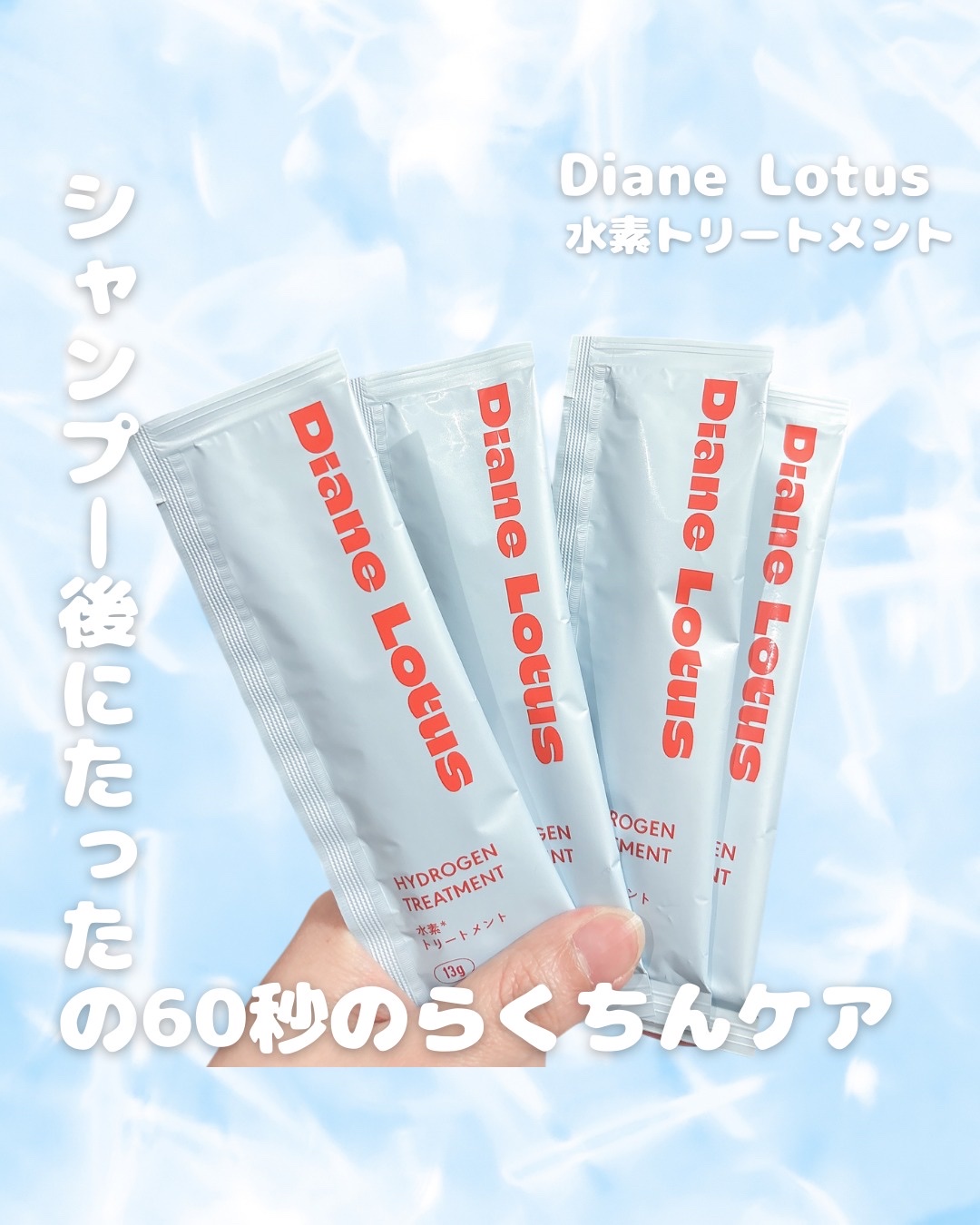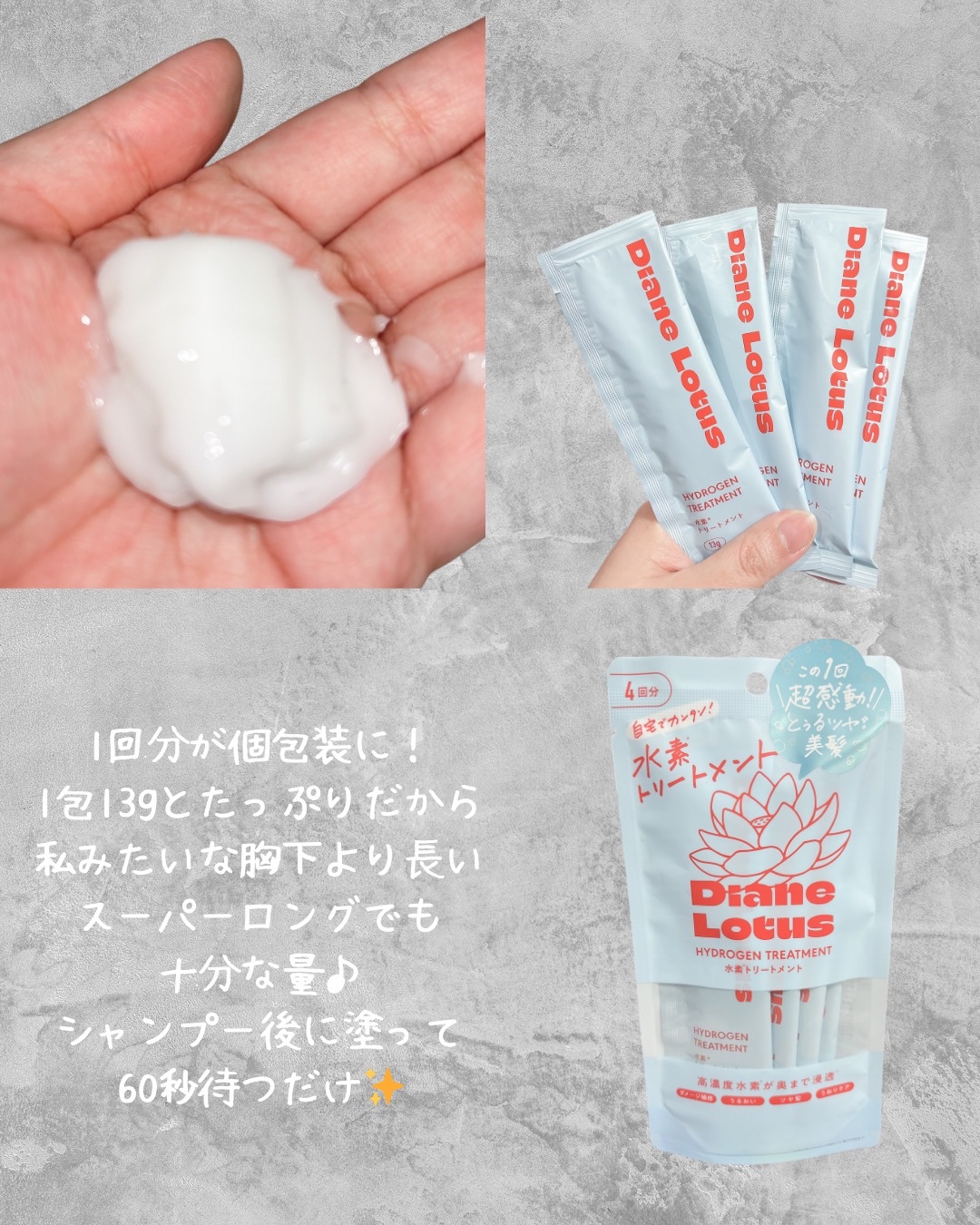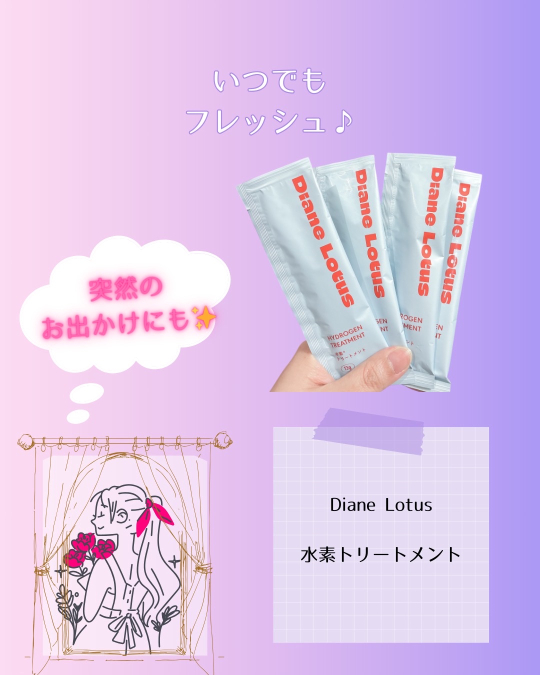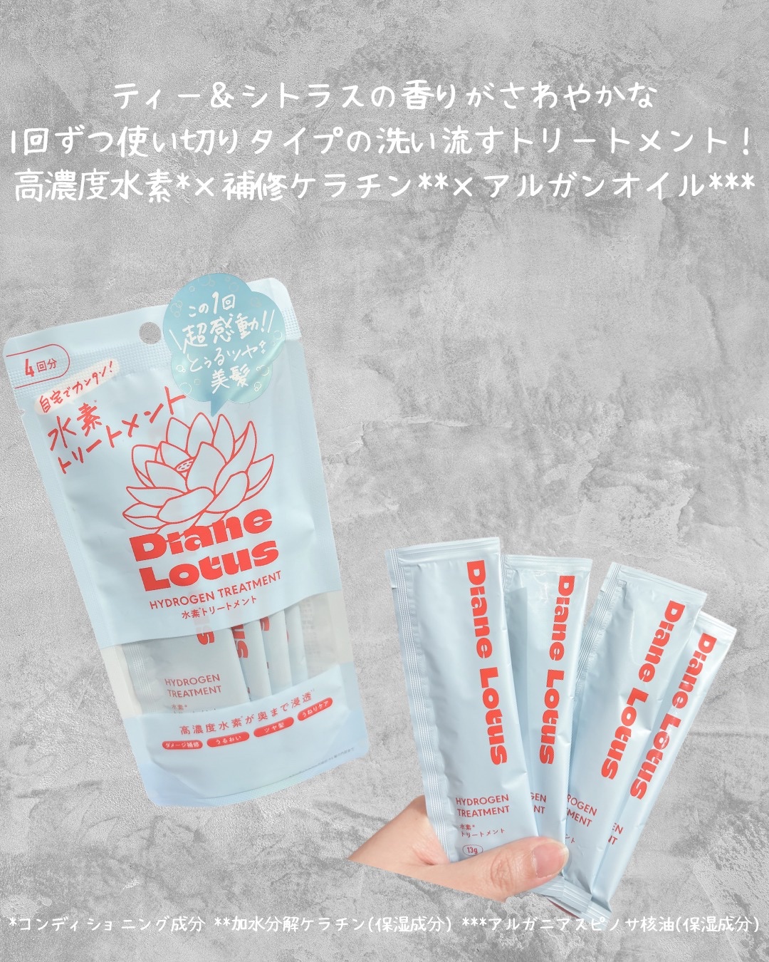 DianeLotus水素トリートメント 話題の水素トリートメントをロフトにて購入しました!個包装で4袋入っています。水素の泡をゲルの中に閉じ込めて高濃度化したヘアトリートメントでケラチンとアルガンオイルを配合しているのでダメージ補修して髪にた...