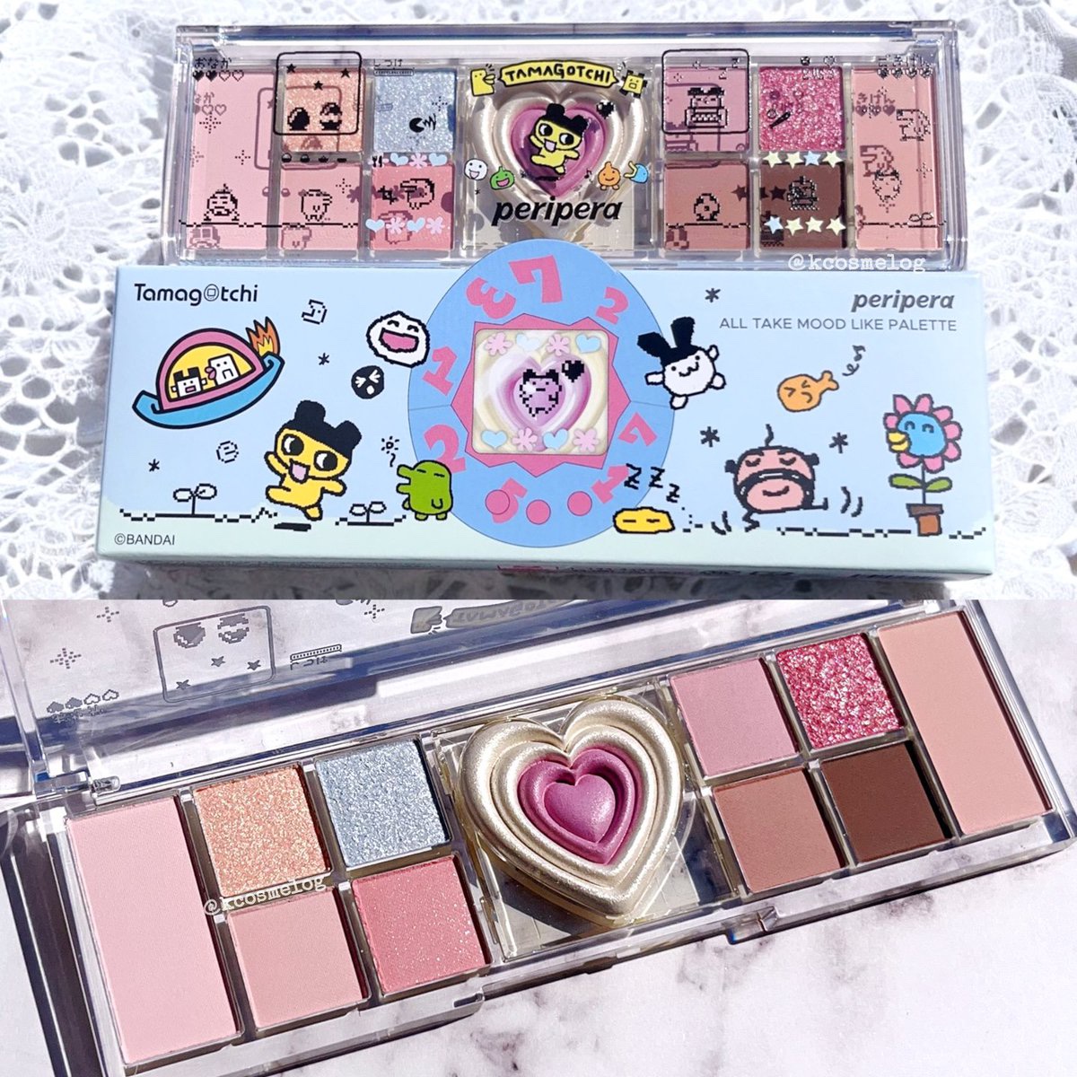「たまごっち」とコラボしたPLAZA・MINiPLA 限定アイテム✨ パッケージから可愛い😍 アイシャドウ・チーク・ハイライターが集結したマルチパレット ハート型のハイライトカラーは、「まめっち」をイメージしたイエローだそうです🙌 肌なじみがいいピンクを中心に、マットとラメ感も楽しめるパレットです🥰