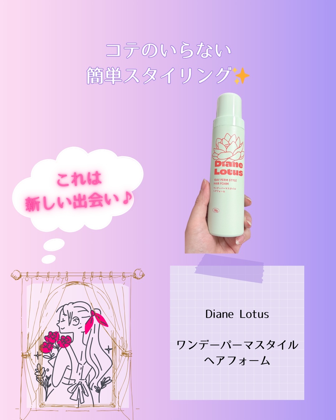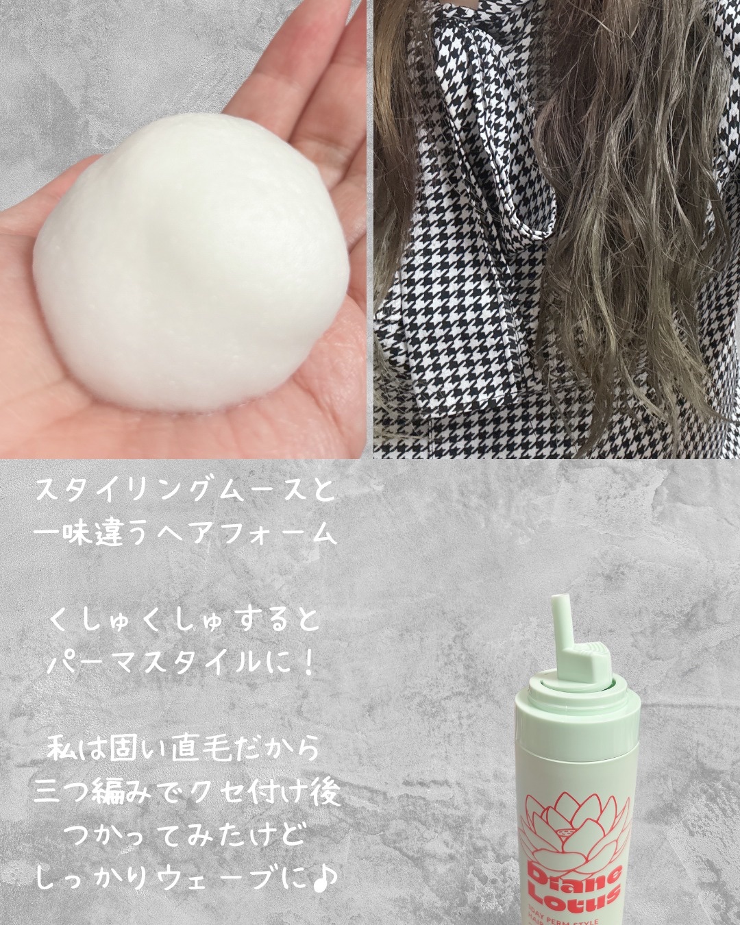 DianeLotusワンデーパーマスタイルヘアフォーム髪になじませてくしゅくしゅするだけでパーマ風スタイルが気軽に楽しめるヘアフォームです髪が固め&多めの私にはどうなのだろう、、?!と思いつつ期待して使ってみました!部分ごとに分けてくしゅくし...