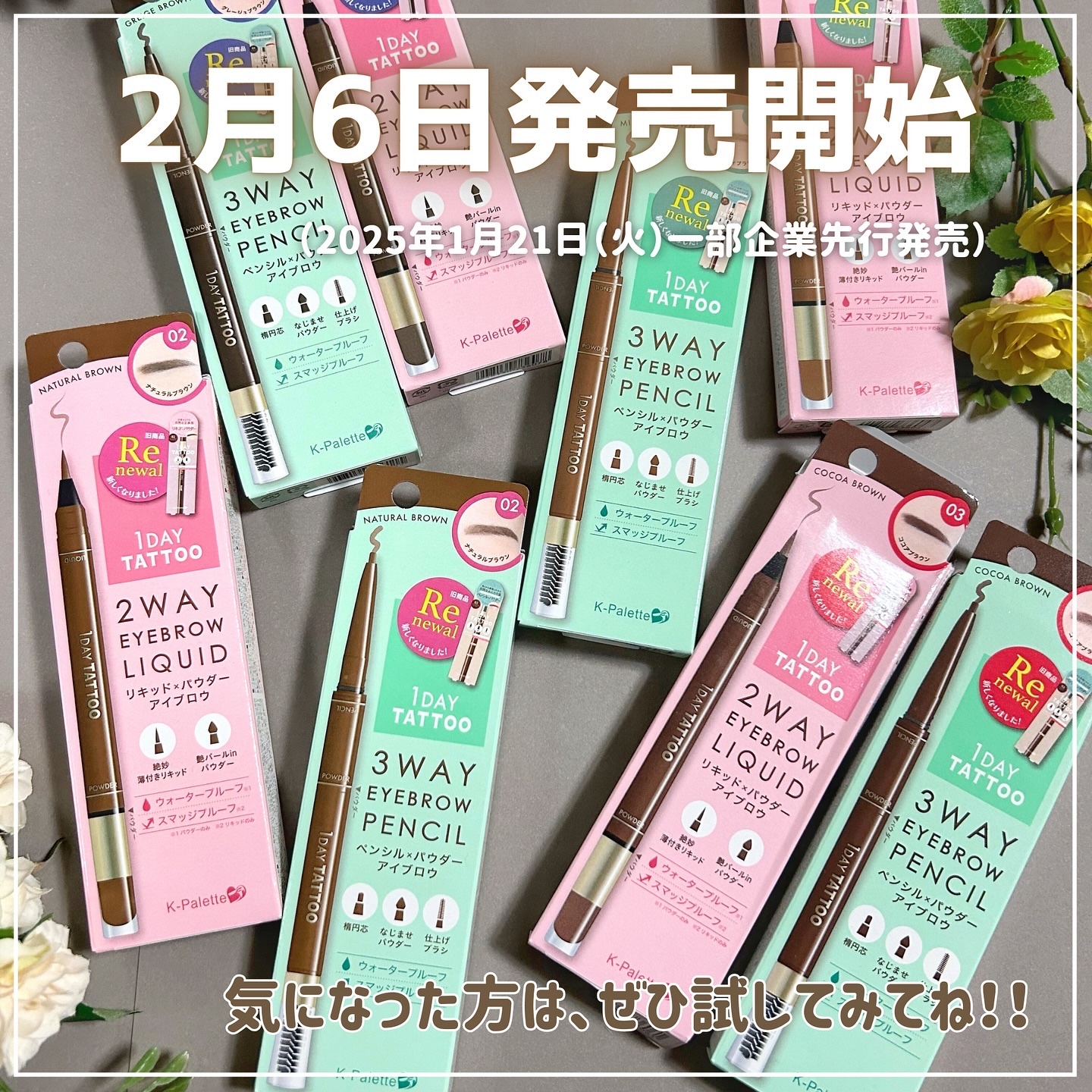 K-パレットの1DAY TATTOOアイブロウシリーズがリニューアル発売‼️ 2025年2月6日(木)〜 (*2025年1月21日(火)一部企業先行発売) リキッドで足してから、ペンシルとパウダーの2本使いで仕上げるのが個人的にお気に入り🩷 カラー共通 01 ミルクティブラウン 02 ナチュラルブラウン 03 ココアブラウン(動画使用カラー) 04 グレージュブラウン