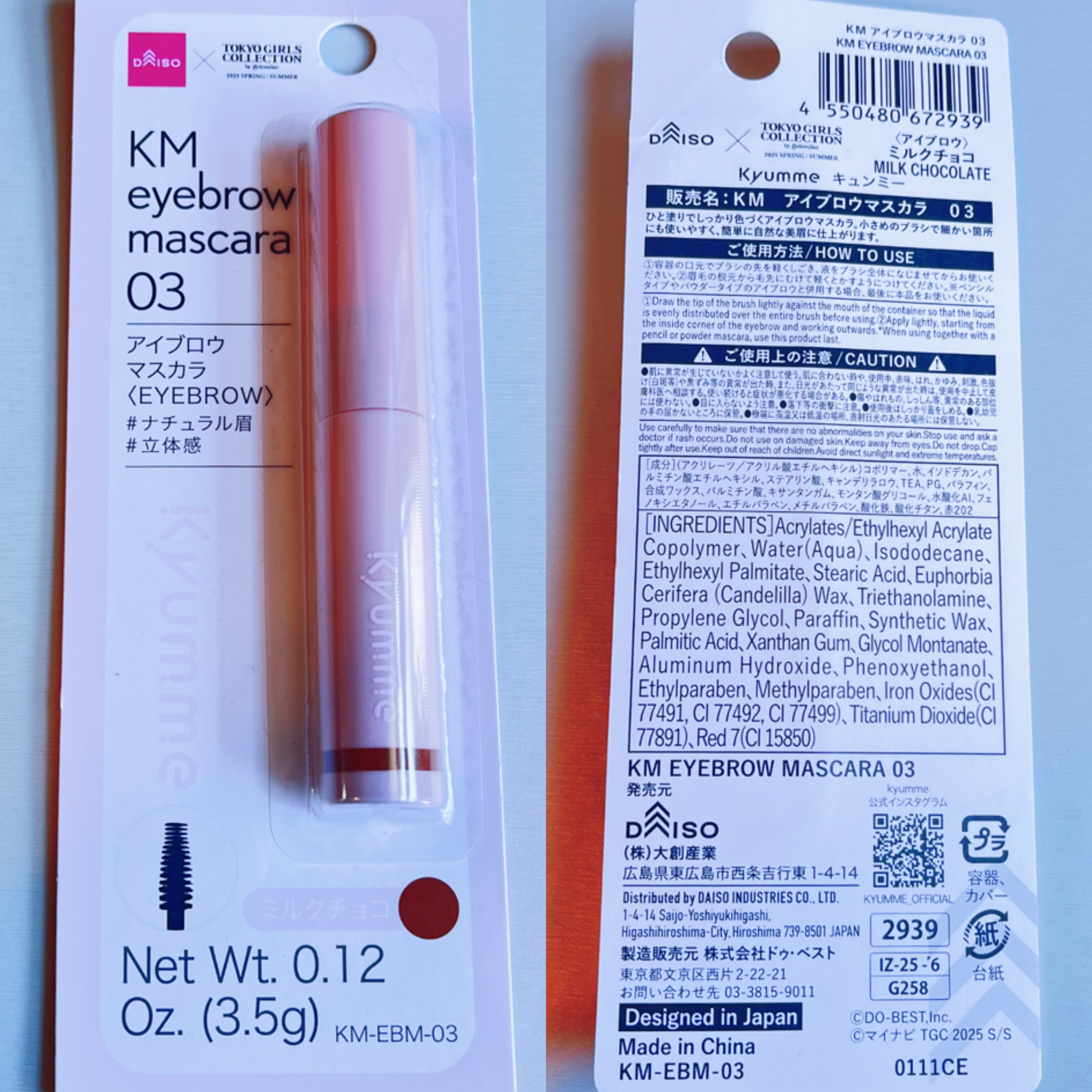 「Kyumme(キュンミー)meets TOKYO GIRLS COLLECTION 2025 SPRING / SUMMER」は全国のDAISO、ダイソーネットストアで本日3月1日(土)より順次発売します。 100円とは思えないクオリティで、すごく使いやすかった⋆⸜👏⸝⋆!! 眉毛が濃いめなのでこの眉マスカラで脱色風にするのもありだな〜と思った💡ˊ-