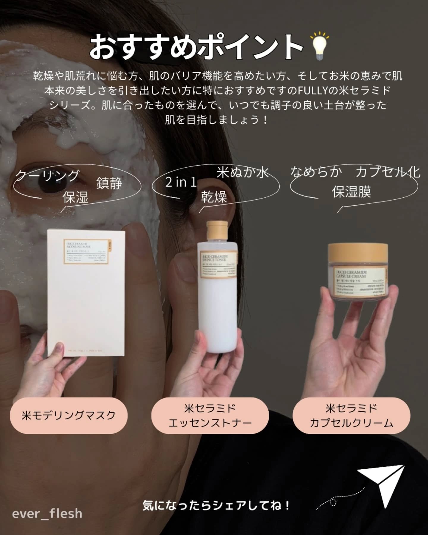 米セラミド エッセンストナー&カプセルクリーム&モデリングマスク✨ヴィーガン韓国コスメブランド、FULLYより。米モチラインシリーズの化粧水、クリーム、マスク!お米のチカラでスキンケアしてみたい、ビーガンブランドが好き、そんな方にぴったりなの...