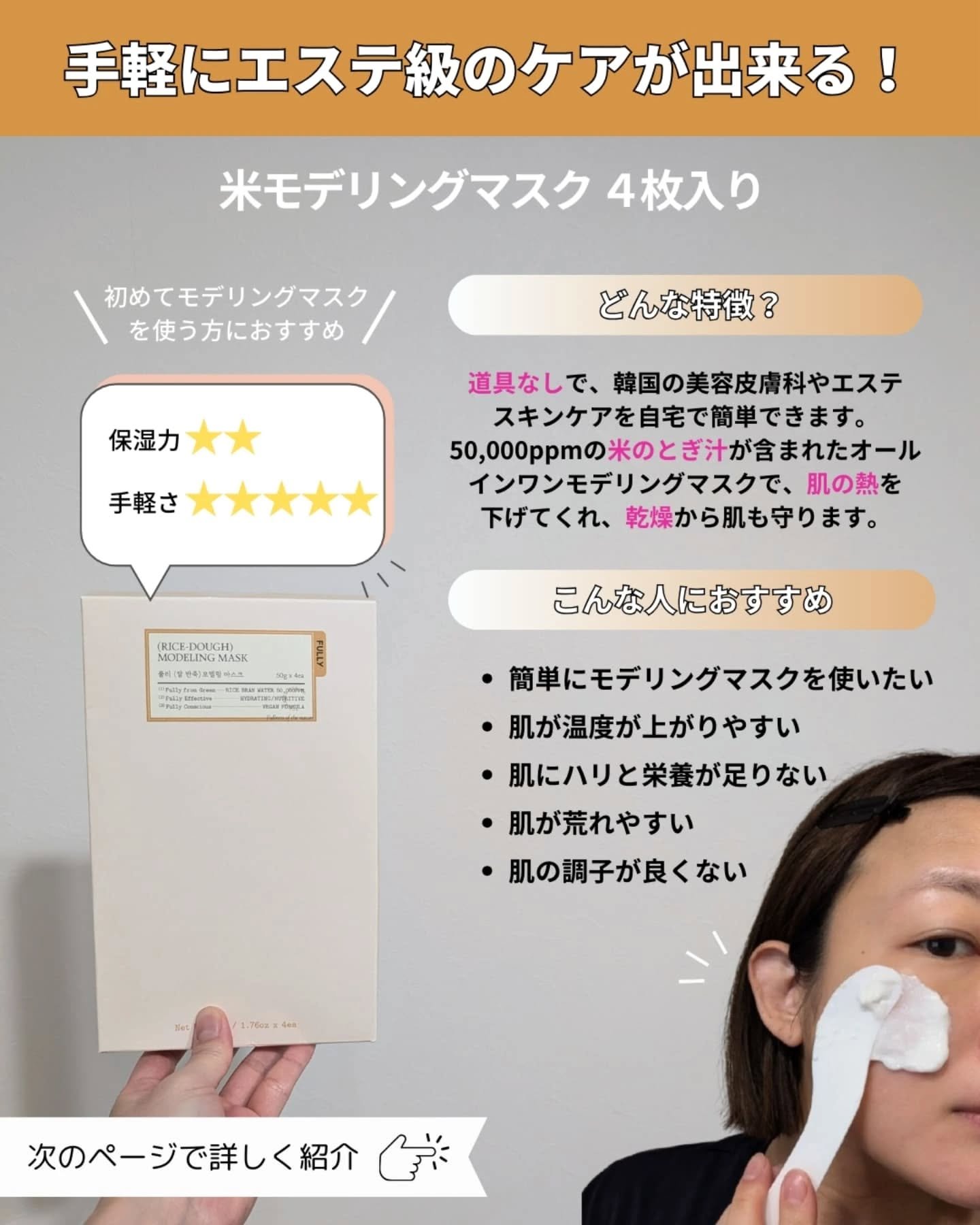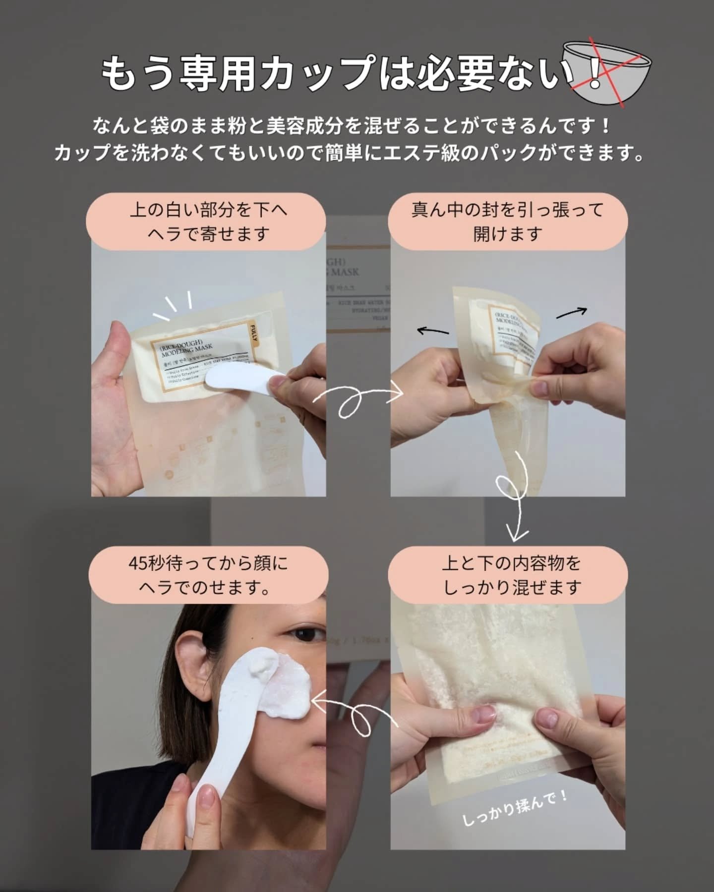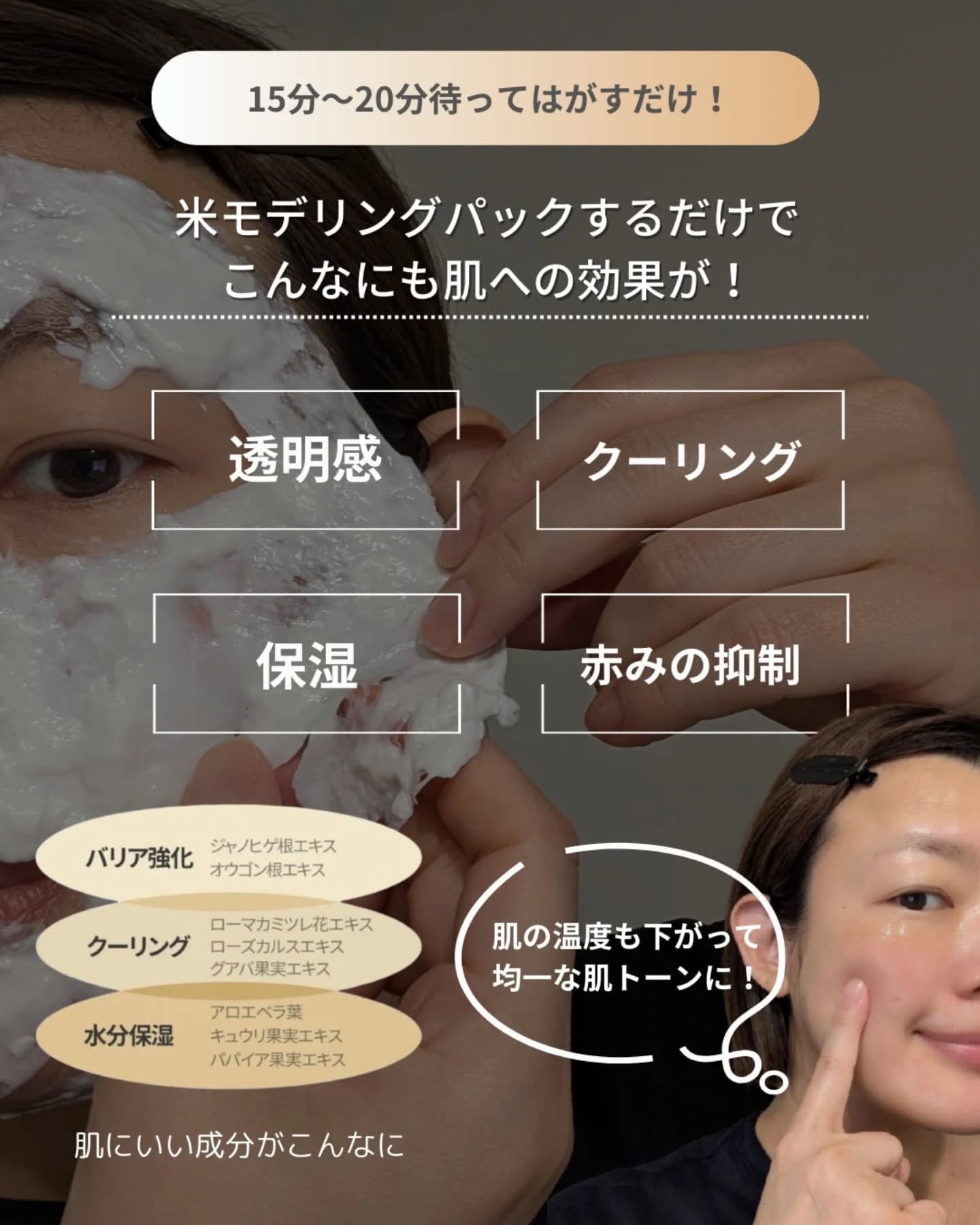 - 天然原料の米で作られた 米モデリングマスク 他の道具がなくても手軽で、顔に残る残渣がなく、量を調節しやすいモデリングマスク 水は必要ない、マスクの中にある米ぬか水(保湿)を利用して潤いたっぷり入ったマスクパック。 クールな使用感&保湿&整肌&ハリ効果 人工香料無添加で肌にやさしい使い心地。