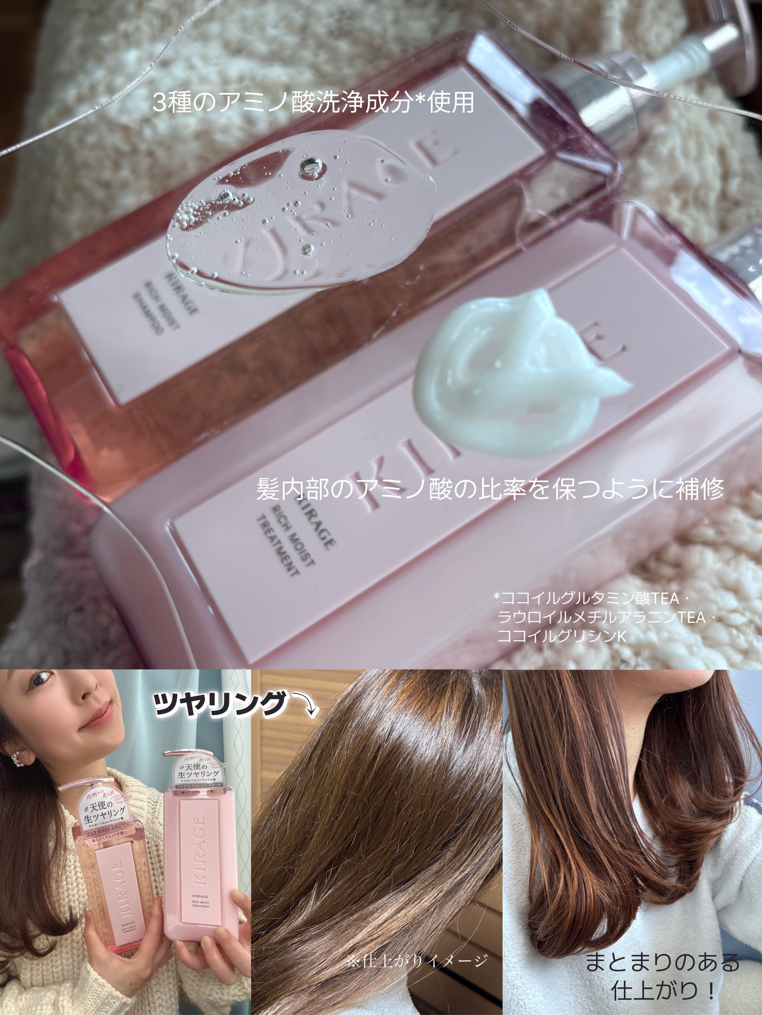 キラージュさまから頂きました🫶リッチモイストシャンプー&トリートメント内側から光を放つ「天使の生ツヤリング」を叶える✨スキンケア発想の厳選成分でダメージケア、スカルプケアまでしてくれる👏ミュゲ&フリージアの香りがとにかくいいし、泡立ちもよくて...