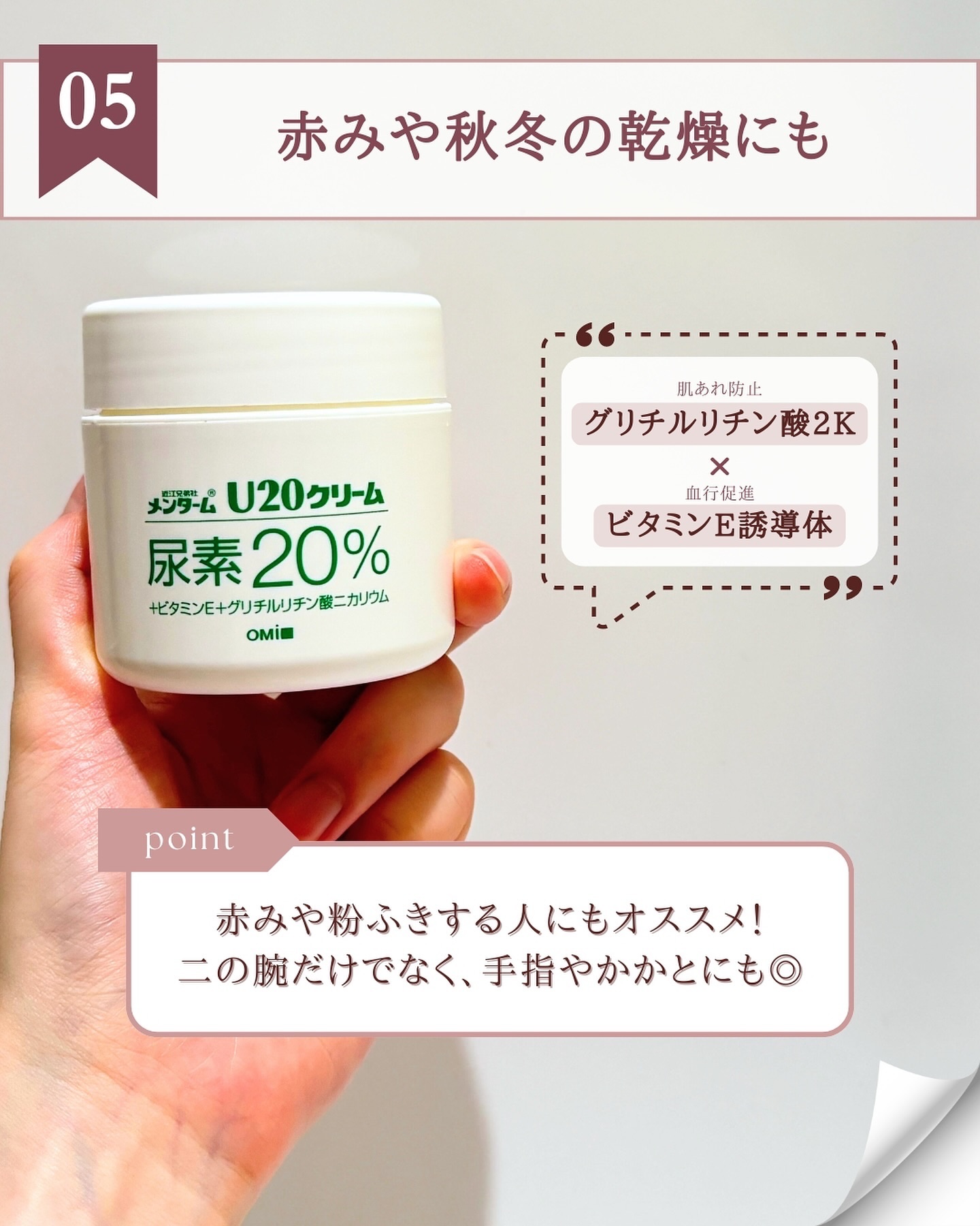 - [第3類医薬品] 乾燥して硬くなった肌を、3つの配合成分が改善します。 <尿素20%> 肌の保湿機能を高めることで、乾燥肌や硬くなったかかとやひじ、ひざをしっとりやわらかに。 <グリチルリチン酸二カリウム> 肌あれを改善し、すこやかに。 <トコフェロール酢酸エステル(ビタミンE)> 血行を促進し、新陳代謝をアップ。 カサカサ、カチカチになったお肌にものばしやすく、ベタつかないクリームです。