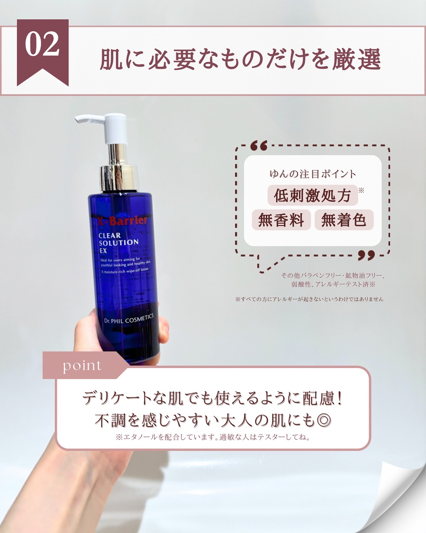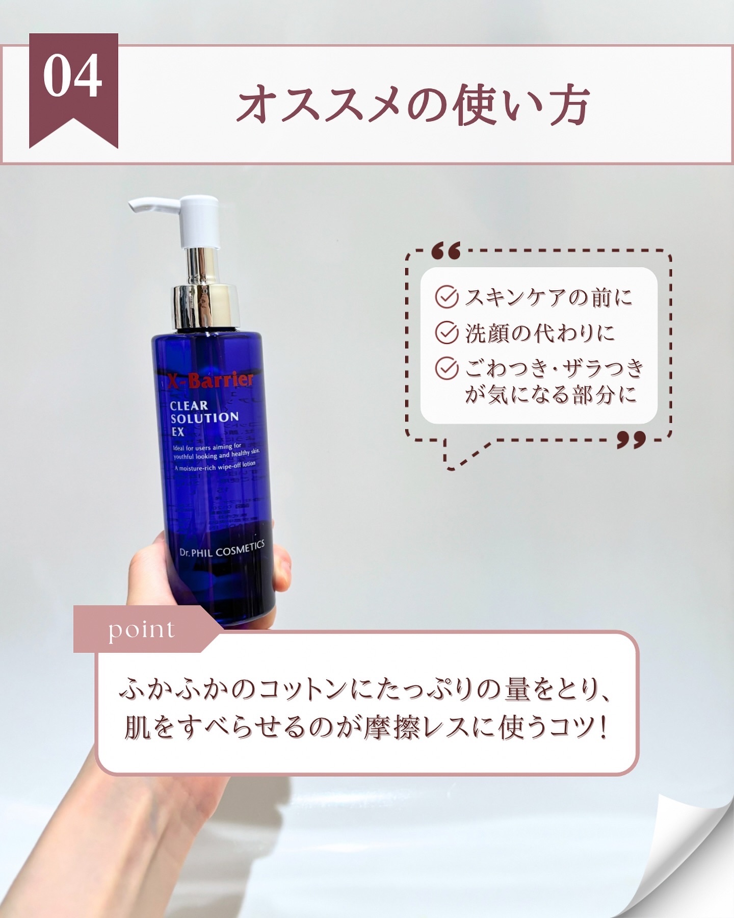 - Point1 使い心地のよい「角質柔軟成分」配合。肌あたりの良いベースで、摩擦レスな使用感 「角質柔軟成分」にAHA(乳酸、クエン酸)を採用。もともと肌に存在する天然保湿因子の一種である「乳酸」と、フルーツ酸とも呼ばれる「クエン酸」を配合した肌あたりのよいベースで、肥厚した角層を柔軟にし、古い角質をふきとり整えます。また、肌をつるんとした薄膜でコーティングし、すべすべでなめらかな後肌をかなえる「スムースコーティング成分※4」と、ベタつきがなく浸透感※5があり、肌をやわらげながらうるおいを与える「ソフニングモイスチュア成分※6」を配合。余分な皮脂や角質をしっかりふきとりながらも摩擦レスな使用感を実現しました。 Point2 「角質リペア※7CPX※8」が加齢で生じる大人の肌悩みまでケア 従来品にも配合されていた「グリコシルトレハロース」や「紫玄米ヌカエキス」に加え、ビタミンEとビタミンCを結合させたハイブリッドな成分「EPC」と、植物由来の「ゲンノショウコエキス」を新配合。加齢で乾燥し、くすみがちな肌にうるおいを与え、若々しい印象の、透明感のある肌へと導きます。 ●角質リペア※7CPX※8 Point3 「うるおいバリア成分※9」が角層にうるおいを与え、健やかな肌環境に整える 優れた保水力を持つ「サクランTM」をはじめ、角層バリアのうるおい保持に重要な役割を果たす「セラミド類似ポリマー」、角層深部まで浸透して保湿する「加水分解ヒアルロン酸」などで構成される「うるおいバリア成分※9」を配合。角層をうるおいで満たし、みずみずしく健やかな肌環境をキープします。 ●うるおいバリア成分※9 ●無香料・無着色・パラベンフリー・鉱物油フリー ●弱酸性・低刺激処方 ●アレルギーテスト済み *すべてのかたにアレルギーが起きないというわけではありません。 ※4:PEG-400(保湿) ※5:角層まで ※6:グリセレス-26、PPG-9ジグリセリル(保湿) ※7:お手入れのこと ※8:EPC[(アスコルビル/トコフェリル)リン酸K]、ゲンノショウコエキス、紫玄米ヌカエキス、グリコシルトレハロース、グリセリン(以上すべて保湿) ※9:サクランTM[スイゼンジノリ細胞外多糖体]、加水分解ヒアルロン酸、セラミド類似ポリマー[(メタクリル酸グリセリルアミドエチル/メタクリル酸ステアリル)コポリマー]、グリセリン(以上すべて保湿)