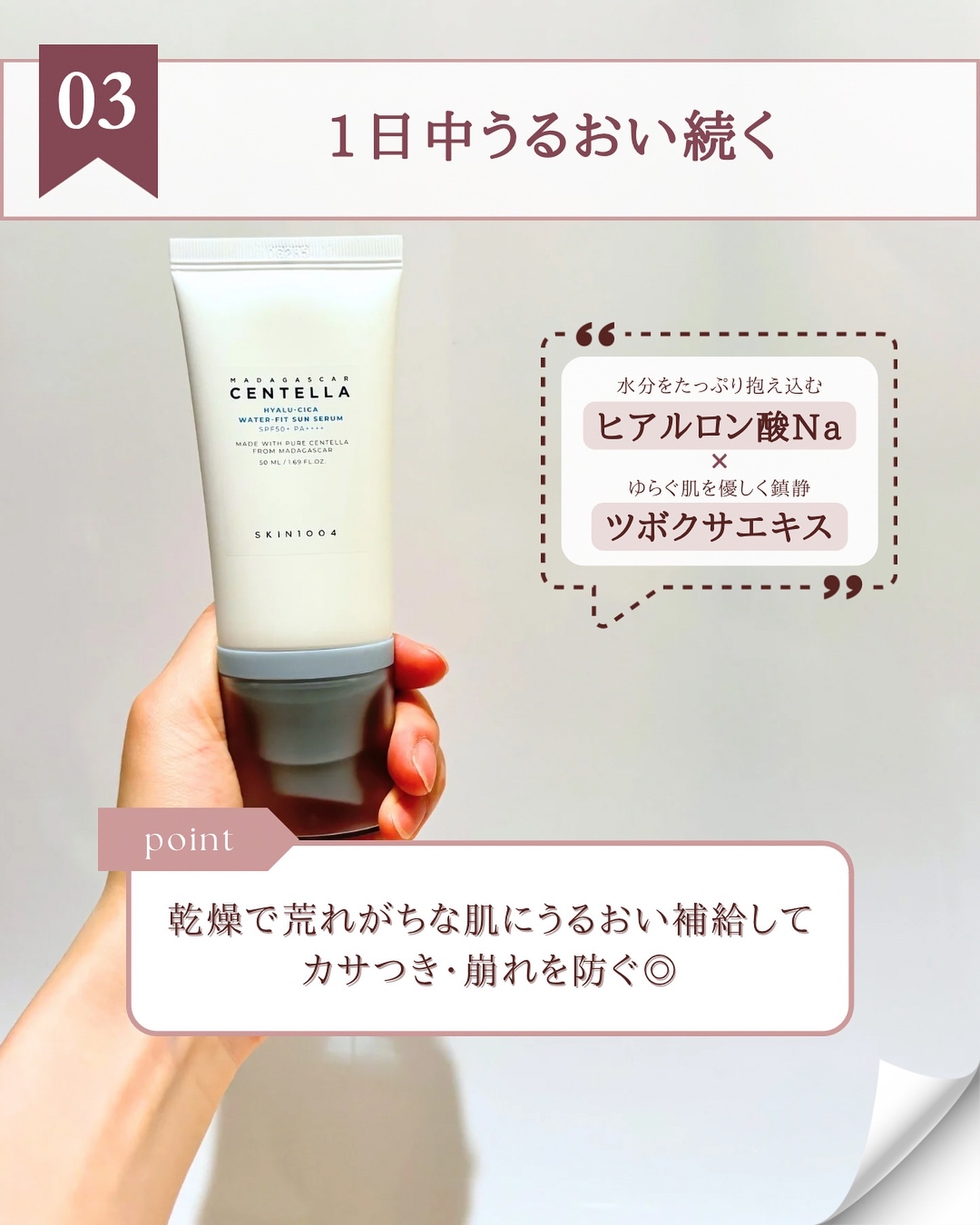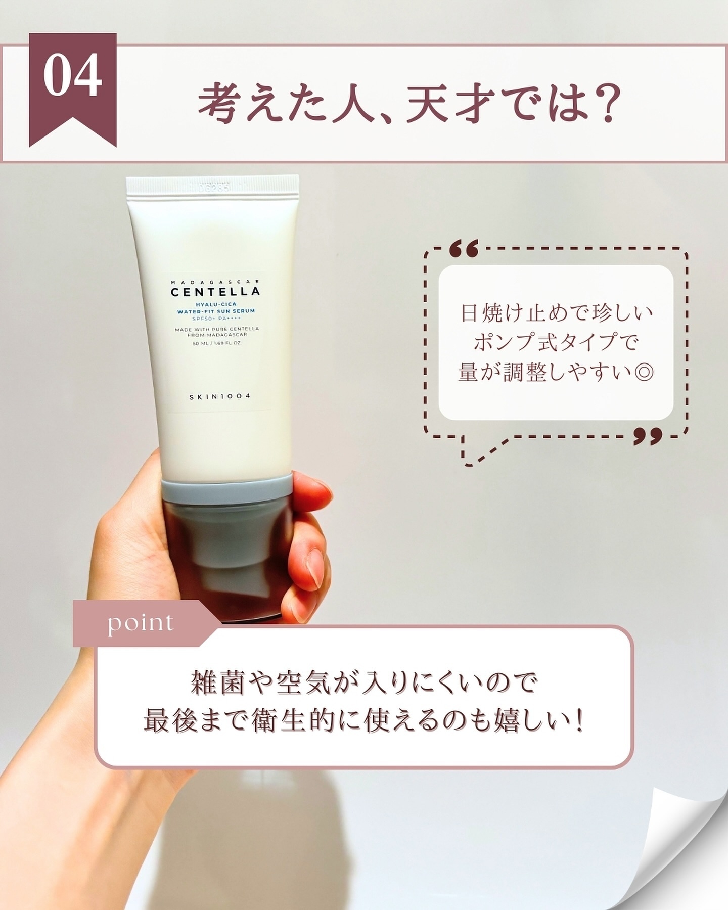 SKIN1004MADAGASCARCENTELLAHYALU-CICAWATER-FITSUNSERUMSPF50+PA++++もうこれはもはや日焼け止めなの?ってくらい軽くて付け心地のいい日焼け止め😍水々しいテクスチャでベタつかず、キシキ...