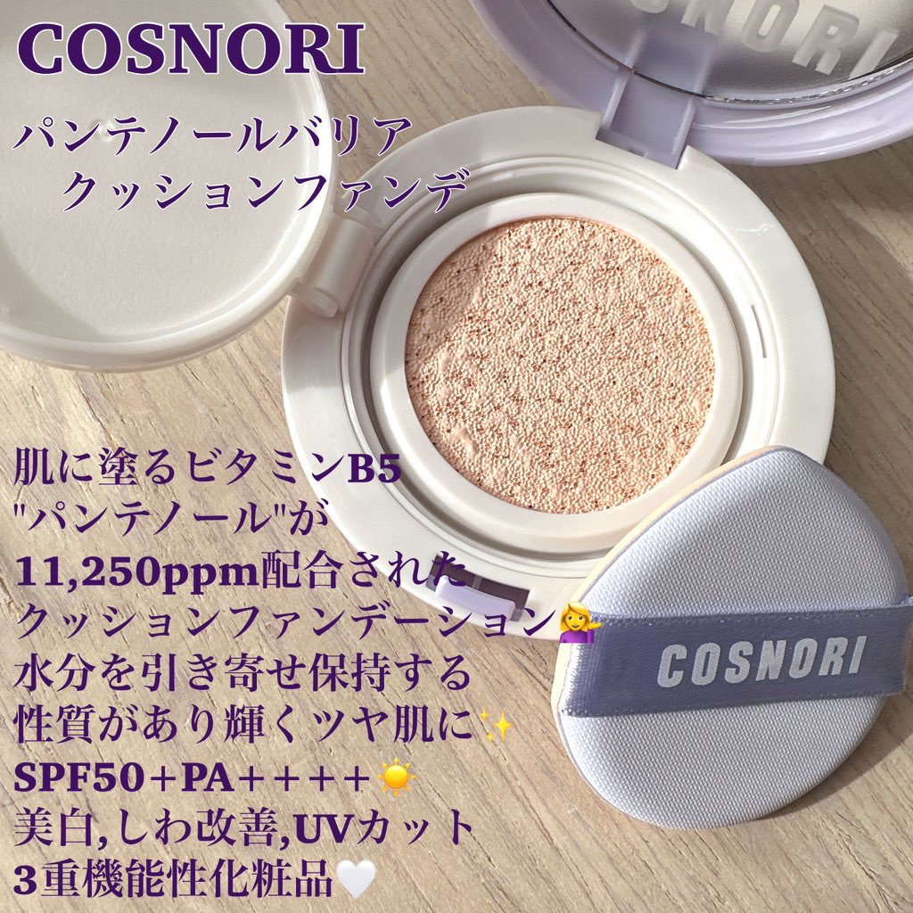 COSNORIパンテノールバリアクッションファンデーション01アイボリーお試しさせていただきました。薄紫のパッケージがとっても好み💜そして機能性も抜群なのです。美白、しわ改善、UVカットが叶い、SPF50+,PA++++と申し分ない紫外線予防...