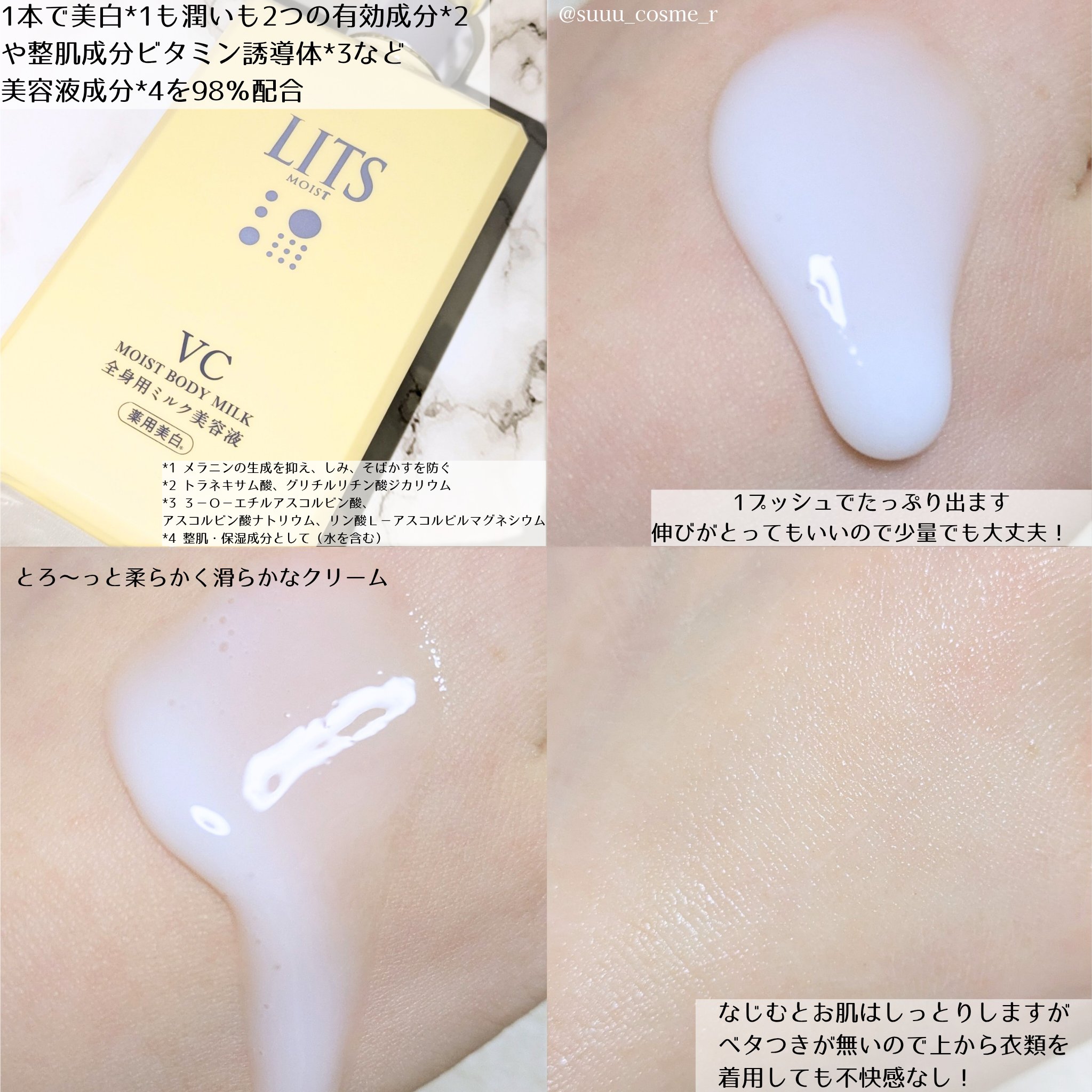 LITSの大人気スキンケア(モイストローションC+ミルクエッセンス)が1つになったボディミルクが誕生!うるおうけどベタつきがないから、すぐ服が着れる優れもの。モイストCから美白*1・うるおいのミルク美容液誕生!1本で美白*1も潤いも2つの有効...