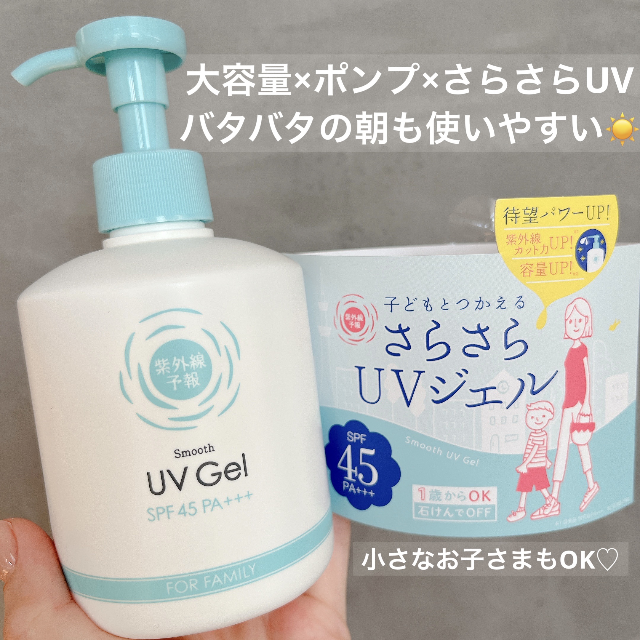 紫外線カット力UP☀️ 体・顔用SPF45 PA +++容量:260g スーッと伸びてさらさらと軽いつけ心地◎ 塗るとすぐ透明になって白浮きしない🙆♀️ 1歳からOKで石けんオフできるので家族みんなで使えるのが嬉しい♪