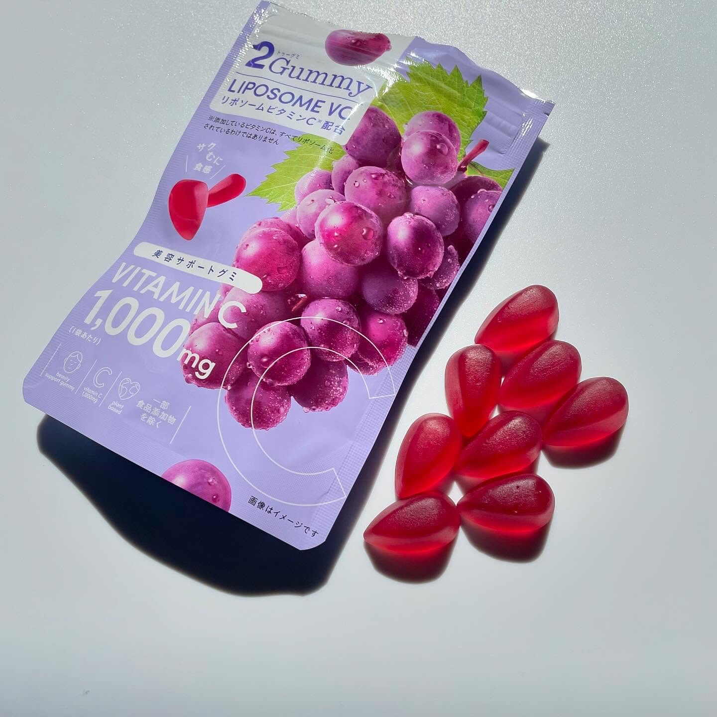- 「食べるリポソームビタミンC」登場。2Gummyは、話題のリポソームビタミンCを配合したグミ。量と頻度に着目し、1袋にビタミンCを1,000mg配合。おやつ感覚で、いつでもどこでもビタミンCをチャージできます。