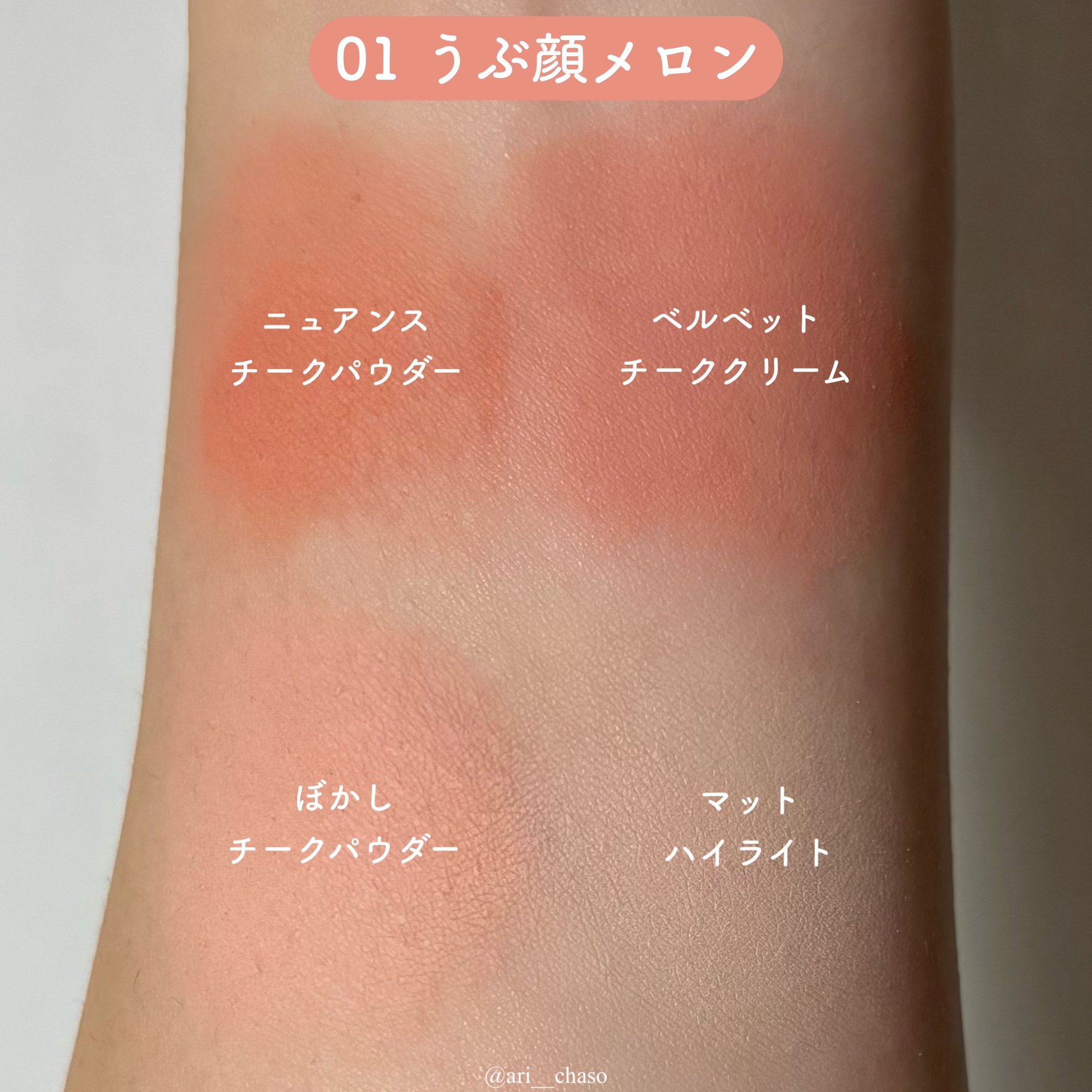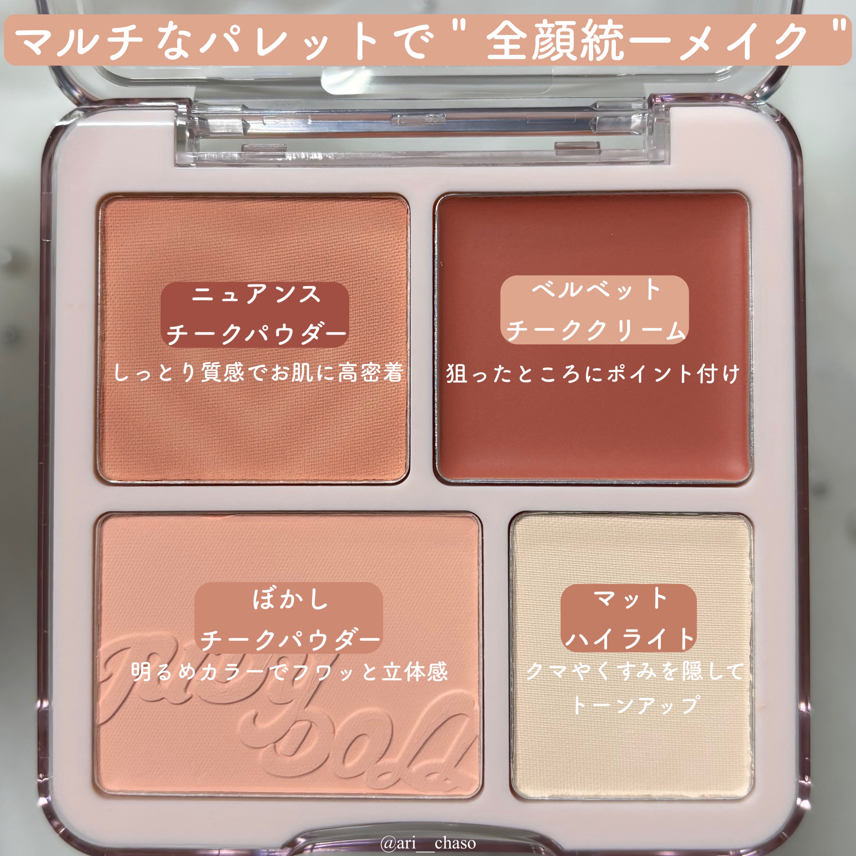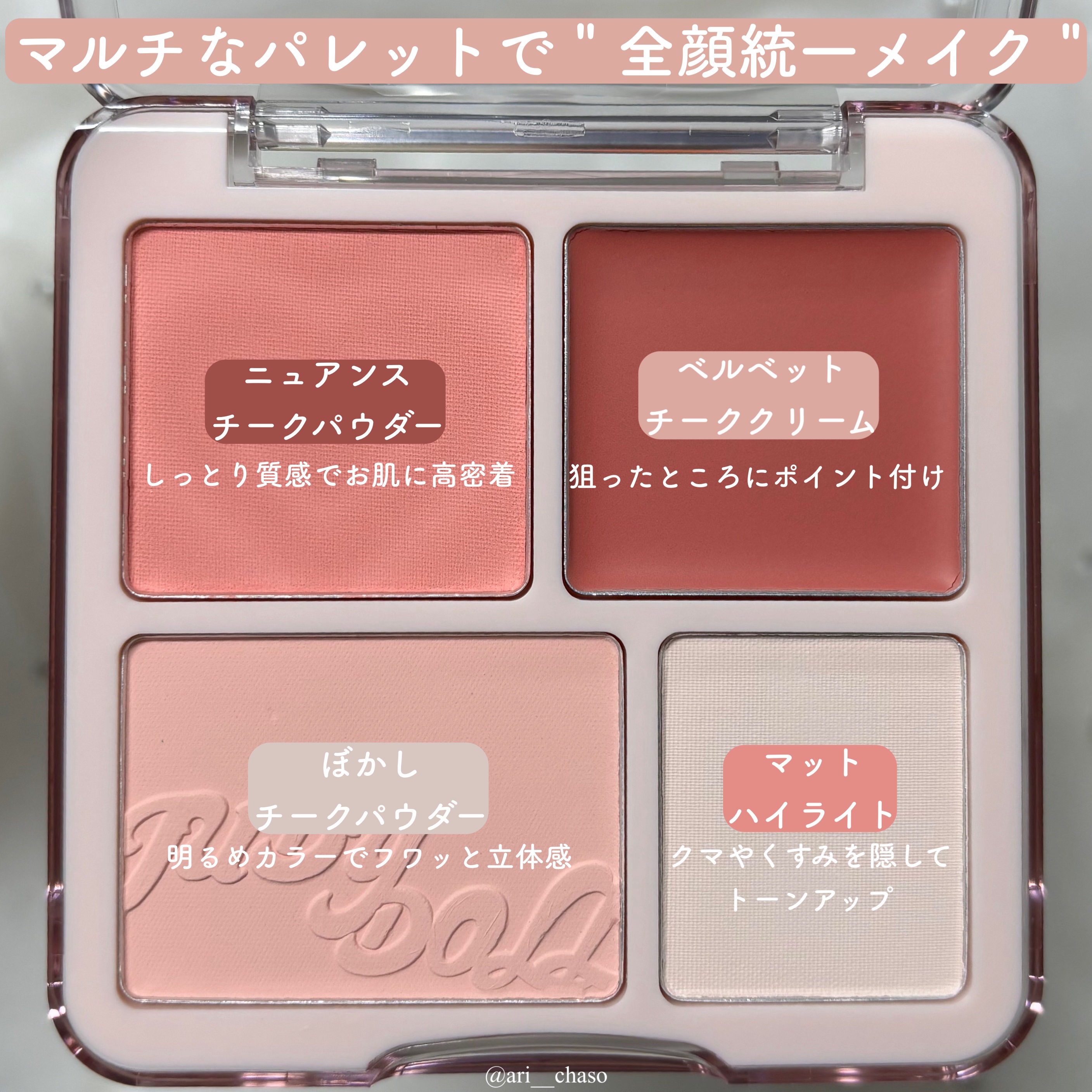 ニュアンスチークパウダー・ベルベットチーククリーム・ぼかしチークパウダー・マットハイライトが1つのパレットに‼️ チークカラーはアイシャドウとしても、マットハイライトは涙袋作りにも使えます👍 パウダーはしっとり質感で粉飛びなく、クリームはふんわりぼかせてムラになりにくいです。 どの色味も可愛く思わず全色買い🤣