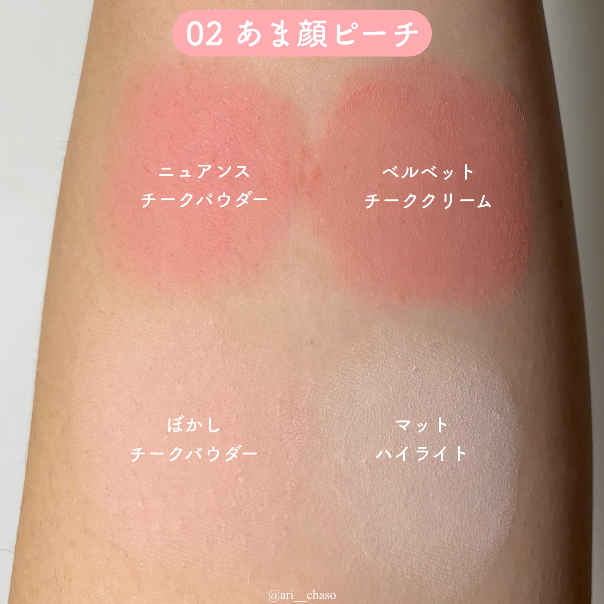 - <02 あま顔ピーチ> ①タルク、シリカ、マイカ、合成ワックス、ラウリン酸ヘキシル、ポリメチルシルセスキオキサン、(ビニルジメチコン/メチコンシルセスキオキサン)クロスポリマー、トリエトキシカプリリルシラン、ジフェニルシロキシフェニルトリメチコン、トリ(カプリル酸/カプリン酸)グリセリル、ジメチコン、カプリリルグリコール、水酸化Al、エチルヘキシルグリセリン、酢酸トコフェロール、水添レシチン、アミノプロピルトリエトキシシラン、酸化チタン、赤201、黄4、赤226、酸化鉄 ②ジメチコン、(ジメチコン/ビニルトリメチルシロキシケイ酸)クロスポリマー、イソノナン酸イソノニル、ポリメチルシルセスキオキサン、トリベヘニン、トリイソステアリン酸ポリグリセリル‒2、(VP/ヘキサデセン)コポリマー、合成ワックス、ラウリルPEG‒9ポリジメチルシロキシエチルジメチコン、イソステアリン酸ソルビタン、フェノキシエタノール、(ジメチコン/ビニルジメチコン)クロスポリマー、メドウフォーム種子油、スクワラン、酢酸トコフェロール、トリエトキシカプリリルシラン、水酸化Al、エチルヘキシルグリセリン、アミノプロピルトリエトキシシラン、トコフェロール、酸化チタン、赤226、酸化鉄、黄4、赤227 ③タルク、シリカ、合成ワックス、マイカ、ラウリン酸ヘキシル、ポリメチルシルセスキオキサン、(ビニルジメチコン/メチコンシルセスキオキサン)クロスポリマー、トリエトキシカプリリルシラン、ジフェニルシロキシフェニルトリメチコン、トリ(カプリル酸/カプリン酸)グリセリル、ジメチコン、カプリリルグリコール、水酸化Al、エチルヘキシルグリセリン、酢酸トコフェロール、水添レシチン、酸化チタン、グンジョウ、赤226、黄4、酸化鉄 ④タルク、マイカ、シリカ、合成ワックス、ポリメチルシルセスキオキサン、トリエトキシカプリリルシラン、フェニルトリメチコン、ジメチコン、トリ(カプリル酸/カプリン酸)グリセリル、ラウリン酸ヘキシル、(ビニルジメチコン/メチコンシルセスキオキサン)クロスポリマー、カプリリルグリコール、水添レシチン、水酸化Al、エチルヘキシルグリセリン、酢酸トコフェロール、酸化チタン、グンジョウ、酸化鉄、赤226 <03 ほて顔チェリー> ①タルク、シリカ、合成ワックス、マイカ、ラウリン酸ヘキシル、ポリメチルシルセスキオキサン、(ビニルジメチコン/メチコンシルセスキオキサン)クロスポリマー、トリエトキシカプリリルシラン、ジフェニルシロキシフェニルトリメチコン、トリ(カプリル酸/カプリン酸)グリセリル、ジメチコン、カプリリルグリコール、水酸化Al、エチルヘキシルグリセリン、酢酸トコフェロール、水添レシチン、アミノプロピルトリエトキシシラン、酸化チタン、グンジョウ、赤226、赤201、黄4 ②ジメチコン、(ジメチコン/ビニルトリメチルシロキシケイ酸)クロスポリマー、イソノナン酸イソノニル、トリベヘニン、ポリメチルシルセスキオキサン、トリイソステアリン酸ポリグリセリル‒2、(VP/ヘキサデセン)コポリマー、合成ワックス、ラウリルPEG‒9ポリジメチルシロキシエチルジメチコン、イソステアリン酸ソルビタン、フェノキシエタノール、(ジメチコン/ビニルジメチコン)クロスポリマー、酢酸トコフェロール、スクワラン、メドウフォーム種子油、トリエトキシカプリリルシラン、水酸化Al、エチルヘキシルグリセリン、トコフェロール、酸化チタン、赤226、酸化鉄、黄4、赤218、赤227、青1 ③タルク、シリカ、合成ワックス、マイカ、ラウリン酸ヘキシル、ポリメチルシルセスキオキサン、(ビニルジメチコン/メチコンシルセスキオキサン)クロスポリマー、トリエトキシカプリリルシラン、ジフェニルシロキシフェニルトリメチコン、トリ(カプリル酸/カプリン酸)グリセリル、ジメチコン、カプリリルグリコール、エチルヘキシルグリセリン、酢酸トコフェロール、水酸化Al、水添レシチン、アミノプロピルトリエトキシシラン、酸化チタン、グンジョウ、赤226、黄4、赤218 ④タルク、マイカ、シリカ、合成ワックス、ポリメチルシルセスキオキサン、トリエトキシカプリリルシラン、トリ(カプリル酸/カプリン酸)グリセリル、ラウリン酸ヘキシル、フェニルトリメチコン、ジメチコン、(ビニルジメチコン/メチコンシルセスキオキサン)クロスポリマー、カプリリルグリコール、水添レシチン、水酸化Al、エチルヘキシルグリセリン、酢酸トコフェロール、酸化チタン、グンジョウ、赤226、酸化鉄、黄4