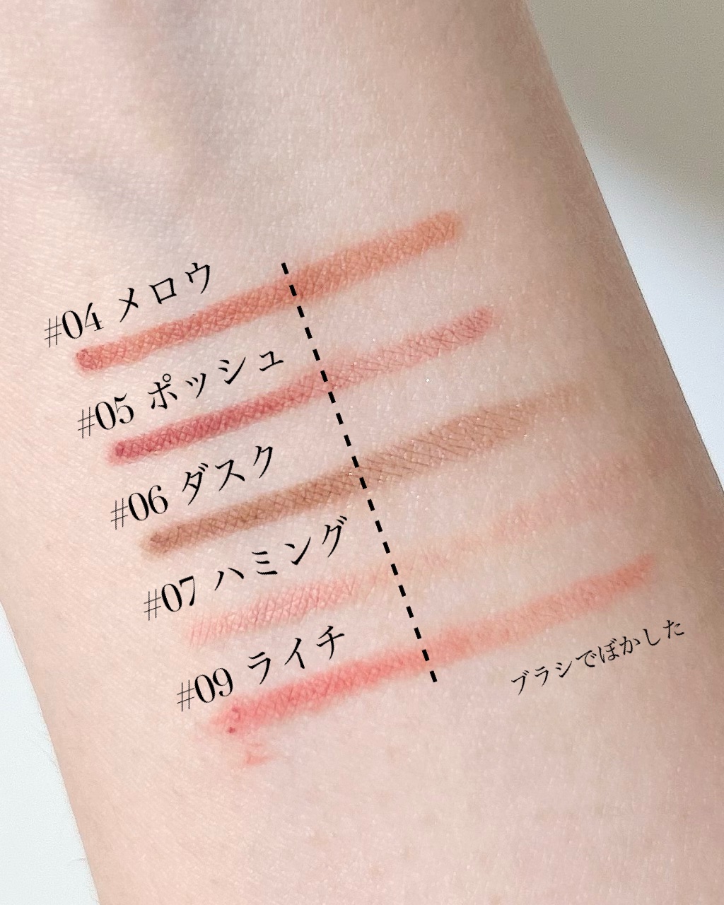 - <02 ファジー(Fuzzy)> トリメチルシロキシケイ酸、メチルトリメチコン、マイカ、合成ワックス、イソヘキサデカン、酸化鉄、グンジョウ、酸化チタン、セレシン、カルナウバロウ、トリイソステアリン酸ポリグリセリル-2、セテアリルアルコール、(アクリレーツ/アクリル酸ステアリル/メタクリル酸ジメチコン)コポリマー、オクチルドデカノール、マンガンバイオレット、メチコン、ジメチコン、水酸化Al、ジステアルジモニウムヘクトライト、炭酸プロピレン、カオリン <04 メロウ(Mellow) > トリメチルシロキシケイ酸、メチルトリメチコン、マイカ、合成ワックス、イソヘキサデカン、酸化チタン、酸化鉄、セレシン、カルナウバロウ、トリイソステアリン酸ポリグリセリル-2、セテアリルアルコール、(アクリレーツ/アクリル酸ステアリル/メタクリル酸ジメチコン)コポリマー、オクチルドデカノール、青1、水酸化Al、ジメチコン、メチコン、赤202、ジステアルジモニウムヘクトライト、リンゴ酸ジイソステアリル、炭酸プロピレン <05 ポッシュ(Posh)> トリメチルシロキシケイ酸、メチルトリメチコン、マイカ、合成ワックス、イソヘキサデカン、酸化鉄、酸化チタン、セレシン、カルナウバロウ、トリイソステアリン酸ポリグリセリル-2、(アクリレーツ/アクリル酸ステアリル/メタクリル酸ジメチコン)コポリマー、セテアリルアルコール、オクチルドデカノール、リンゴ酸ジイソステアリル、メチコン、ジメチコン、水酸化Al、ジステアルジモニウムヘクトライト、赤202、炭酸プロピレン、トリイソステアリン酸イソプロピルチタン <06 ダスク(Dusk)> トリメチルシロキシケイ酸、メチルトリメチコン、マイカ、合成ワックス、イソヘキサデカン、酸化鉄、酸化チタン、セレシン、カルナウバロウ、トリイソステアリン酸ポリグリセリル-2、セテアリルアルコール、(アクリレーツ/アクリル酸ステアリル/メタクリル酸ジメチコン)コポリマー、オクチルドデカノール、メチコン、ジメチコン、水酸化Al、ジステアルジモニウムヘクトライト、炭酸プロピレン <07 ハミング(Humming)> 酸化チタン、合成ワックス、エチルヘキサン酸アルキル(C12-15)、オクチルドデカノール、トリイソステアリン酸ポリグリセリル-2、イソヘキサデカン、セレシン、カルナウバロウ、(VP/ヘキサデセン)コポリマー、(アクリル酸アルキル/アクリル酸ステアリル/アクリル酸ジメチコン)コポリマー、シリカ、黄4、水酸化Al、セテアリルアルコール、ポリイソブテン、ジメチコン、トリイソステアリン酸イソプロピルチタン、青1、マイカ、メチコン <08 バニー(Bunny)> 酸化チタン、合成ワックス、エチルヘキサン酸アルキル(C12-15)、オクチルドデカノール、トリイソステアリン酸ポリグリセリル-2、イソヘキサデカン、セレシン、カルナウバロウ、(VP/ヘキサデセン)コポリマー、(アクリル酸アルキル/アクリル酸ステアリル/アクリル酸ジメチコン)コポリマー、シリカ、黄4、水酸化Al、セテアリルアルコール、ポリイソブテン、ジメチコン、トリイソステアリン酸イソプロピルチタン、青1、マイカ、メチコン <10 ライク(Like)> トリメチルシロキシケイ酸、メチルトリメチコン、マイカ、合成ワックス、イソヘキサデカン、酸化チタン、セレシン、黄4、カルナウバロウ、トリイソステアリン酸ポリグリセリル-2、酸化鉄、赤202、(アクリル酸アルキル/アクリル酸ステアリル/アクリル酸ジメチコン)コポリマー、セテアリルアルコール、オクチルドデカノール、水酸化Al、青1、メチコン、ジメチコン、ジステアルジモニウムヘクトライト、炭酸プロピレン