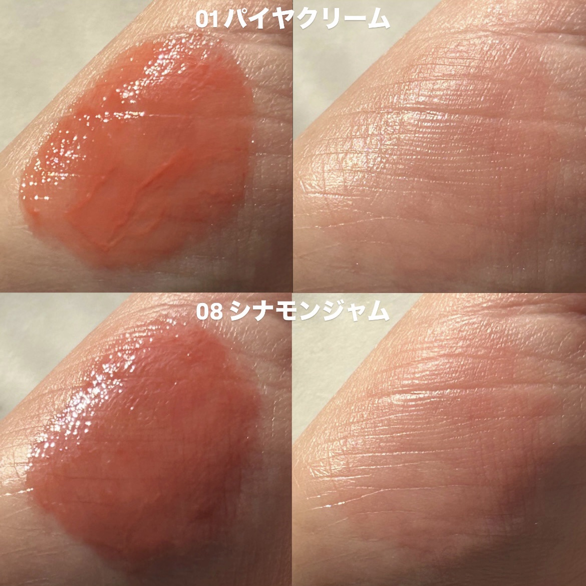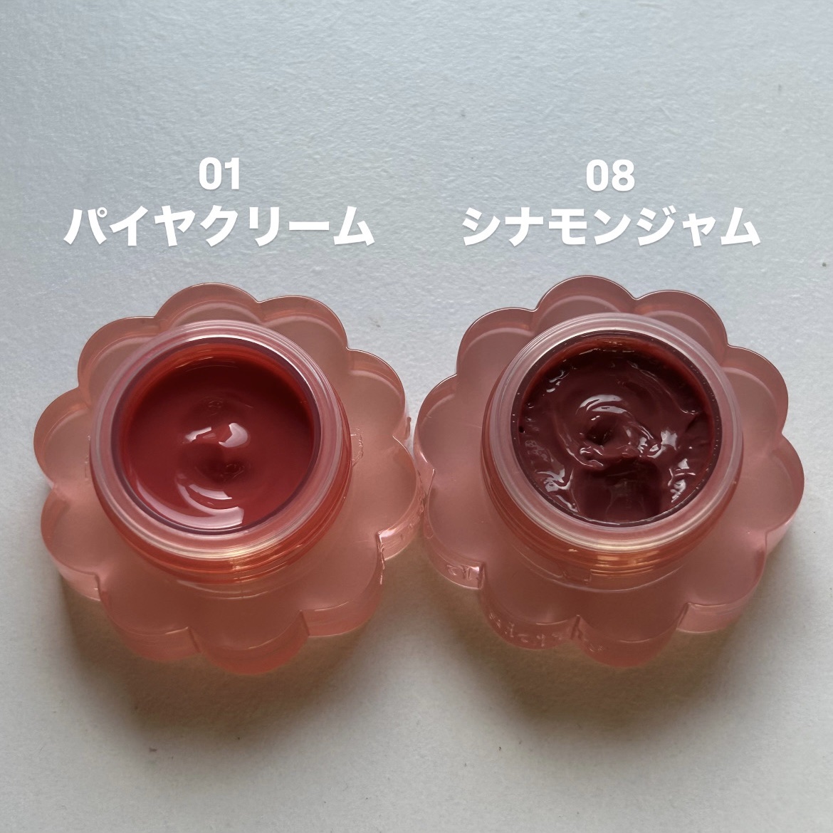 - <01 パパイヤクリーム> 水、ヘキサ(ヒドロキシステアリン酸/ステアリン酸/ロジン酸)ジペンタエリスリチル、トリエチルヘキサノイン、BG、グリセリン、オクチルドデカノール、ポリソルベート60、プロパンジオール、(PEG-240/デシルテトラデセス-20/HDI)コポリマー、1,2-ヘキサンジオール、セテアレス-20、フェノキシエタノール、エチルセルロース、カプリル酸グリセリル、(アクリル酸ヒドロキシエチル/アクリロイルジメチルタウリンNa)コポリマー、トリイソステアリン酸ポリグリセリル-2、リンゴ酸ジイソステアリル、酸化チタン、スクワラン、(アクリレーツ/アクリル酸アルキル(C10-30))クロスポリマー、トロメタミン、香料、エチルヘキシルグリセリン、黄4、赤104(1)、黄5、赤227、エチレンジアミンジコハク酸3Na、イソステアリン酸ソルビタン、ジイソステアリン酸ポリグリセリル-2、リナロール、ラウリン酸K、トコフェロール、青1 <02 ピーチドロップ> 水、ヘキサ(ヒドロキシステアリン酸/ステアリン酸/ロジン酸)ジペンタエリスリチル、トリエチルヘキサノイン、BG、グリセリン、オクチルドデカノール、ポリソルベート60、プロパンジオール、(PEG-240/デシルテトラデセス-20/HDI)コポリマー、1,2-ヘキサンジオール、セテアレス-20、フェノキシエタノール、リンゴ酸ジイソステアリル、酸化チタン、エチルセルロース、カプリル酸グリセリル、(アクリル酸ヒドロキシエチル/アクリロイルジメチルタウリンNa)コポリマー、トリイソステアリン酸ポリグリセリル-2、スクワラン、(アクリレーツ/アクリル酸アルキル(C10-30))クロスポリマー、トロメタミン、香料、エチルヘキシルグリセリン、黄5、赤104(1)、赤227、黄4、エチレンジアミンジコハク酸3Na、イソステアリン酸ソルビタン、ジイソステアリン酸ポリグリセリル-2、青1、リナロール、ラウリン酸K、トコフェロール <03 ハニーマンゴ> 水、ヘキサ(ヒドロキシステアリン酸/ステアリン酸/ロジン酸)ジペンタエリスリチル、トリエチルヘキサノイン、BG、グリセリン、オクチドデカノール、ポリソルベート60、プロパンジオール、(PEG-240/デシルテトラデセス-20/HDI)コポリマー、1,2-ヘキサンジオール、セテアレス-20、フェノキシエタノール、エチルセルロース、リンゴ酸ジイソステアリル、カプリル酸グリセリル、酸化チタン、(アクリル酸ヒドロキシエチル/アクリロイルジメチルタウリンNa)コポリマー、トリイソステアリン酸ポリグリセリル-2、スクワラン、(アクリレーツ/アクリル酸アルキル(C10-30))クロスポリマー、トロメタミン、香料、エチルヘキシルグリセリン、赤104(1)、黄5、赤227、黄4、エチレンジアミンジコハク酸3Na、イソステアリン酸ソルビタン、ジイソステアリン酸ポリグリセリル-2、リナロール、ラウリン酸K、トコフェロール、青1 <04 ピンクバブル> 水、ヘキサ(ヒドロキシステアリン酸/ステアリン酸/ロジン酸)ジペンタエリスリチル、トリエチルヘキサノイン、BG、グリセリン、オクチドデカノール、ポリソルベート60、プロパンジオール、(PEG-240/デシルテトラデセス-20/HDI)コポリマー、1,2-ヘキサンジオール、セテアレス-20、フェノキシエタノール、エチルセルロース、カプリル酸グリセリル、トリイソステアリン酸ポリグリセリル-2、(アクリル酸ヒドロキシエチル/アクリロイルジメチルタウリンNa)コポリマー、スクワラン、(アクリレーツ/アクリル酸アルキル(C10-30))クロスポリマー、リンゴ酸ジイソステアリル、酸化チタン、トロメタミン、香料、エチルヘキシルグリセリン、赤104(1)、酸化鉄、赤227、エチレンジアミンジコハク酸3Na、ジイソステアリン酸ポリグリセリル-2、黄4、イソステアリン酸ソルビタン、黄5、リナロール、ラウリン酸K、トコフェロール <05 アップルゼリー> 水、ヘキサ(ヒドロキシステアリン酸/ステアリン酸/ロジン酸)ジペンタエリスリチル、トリエチルヘキサノイン、BG、グリセリン、オクチドデカノール、ポリソルベート60、プロパンジオール、(PEG-240/デシルテトラデセス-20/HDI)コポリマー、1,2-ヘキサンジオール、セテアレス-20、フェノキシエタノール、トリイソステアリン酸ポリグリセリル-2、エチルセルロース、カプリル酸グリセリル、(アクリル酸ヒドロキシエチル/アクリロイルジメチルタウリンNa)コポリマー、スクワラン、(アクリレーツ/アクリル酸アルキル(C10-30))クロスポリマー、トロメタミン、香料、リンゴ酸ジイソステアリル、酸化チタン、エチルヘキシルグリセリン、赤227、黄5、赤104(1)、黄4、エチレンジアミンジコハク酸3Na、ジイソステアリン酸ポリグリセリル-2、イソステアリン酸ソルビタン、リナロール、ラウリン酸K、トコフェロール、青1 <06 クアバキャンディ> 水、ヘキサ(ヒドロキシステアリン酸/ステアリン酸/ロジン酸)ジペンタエリスリチル、トリエチルヘキサノイン、BG、グリセリン、オクチドデカノール、ポリソルベート60、プロパンジオール、(PEG-240/デシルテトラデセス-20/HDI)コポリマー、1,2-ヘキサンジオール、セテアレス-20、フェノ
