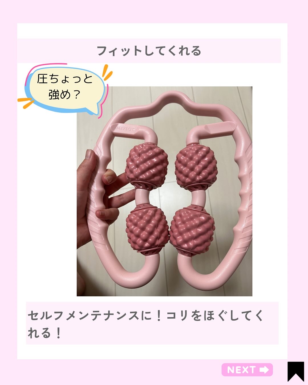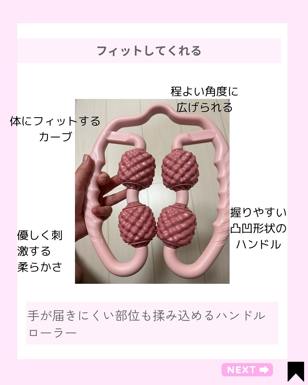 手が届きにくい部位もしっかり揉み込める♪ MIVIOS『ハンドルローラー』 身体を左右から挟こんで、多方向からアプローチできるローラータイプのケアグッズ♥ 柔らかさと弾力のあるEVA素材で作られているから身体に自然にフィットして程よい刺激で筋肉をほぐすことができます。