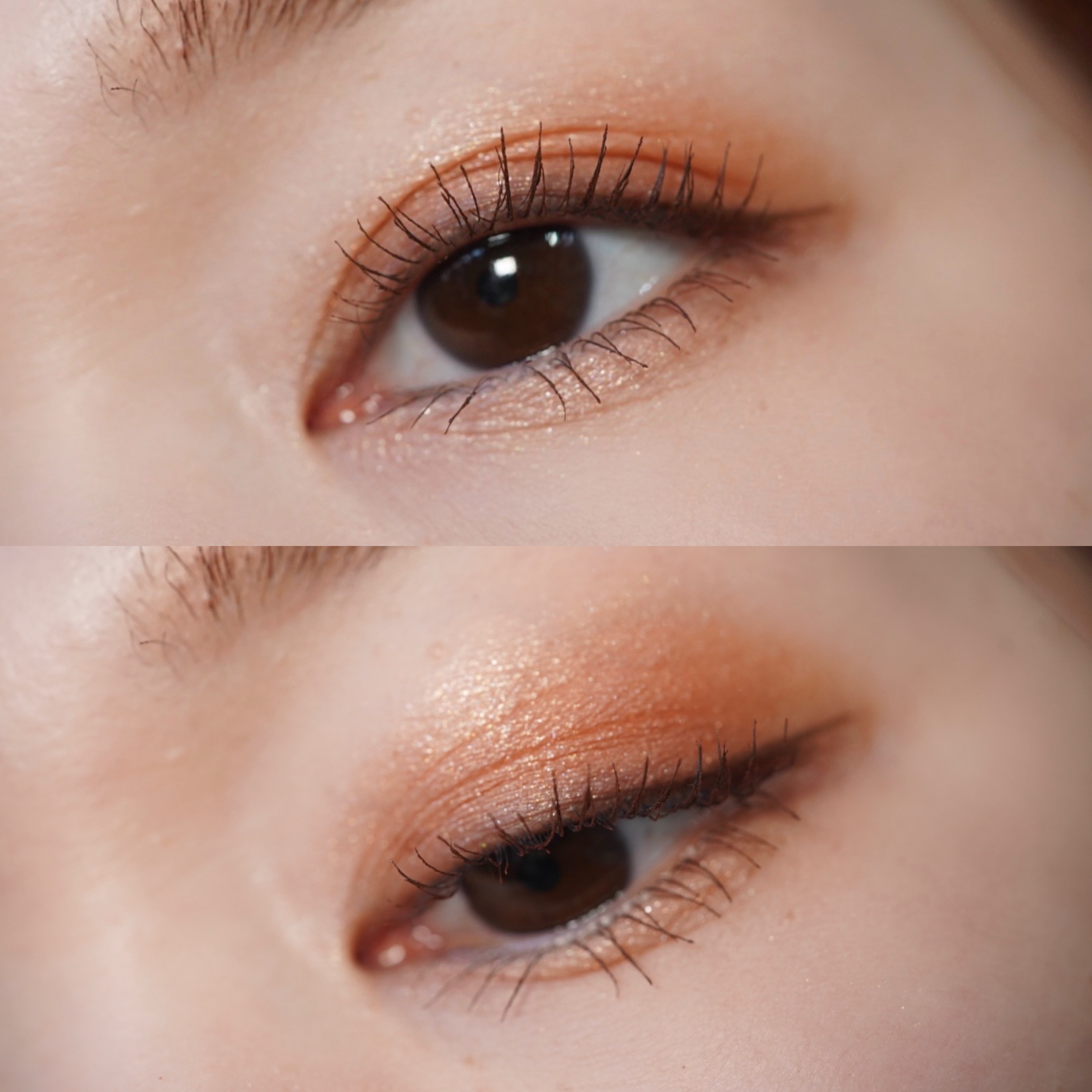 よくパレットのなかで明るいカラーをベースにまぶたに広く塗ることが多いのですが、パール感のあるカラーを避ける🙆♀️! パール感たっぷりの明るいカラーは涙袋に使うぐらい光を集めてぷっくり見せてくれるので、まぶたに広く使うと腫れぼったく見えがち😓 目元を明るくみせてくれたり、次に使うアイシャドウをぼかしやすくしてくれるけど、すっ飛ばしてメインのカラーを塗っちゃう✊🏻❤️🔥 涙袋にはたっぷり塗ってぷっくり見せる🙆♀️💕 シルキースフレアイズのマットタイプはすごく優れているな〜と感じました☺️💗 赤やオレンジなどは、入れすぎると腫れぼったく見えやすいので、見せたいカラーは下まぶた目尻にのせて色をたのしむ♡♡ パール感なしの透けマットだけじゃ物足りない… そう感じさせない華やかなラメが左上に入っているので黒目上と涙袋にのせるとすごく可愛い仕上がりに😍! 厄介な左右差のお陰でマットアイシャドウが好きになりました😌💕
