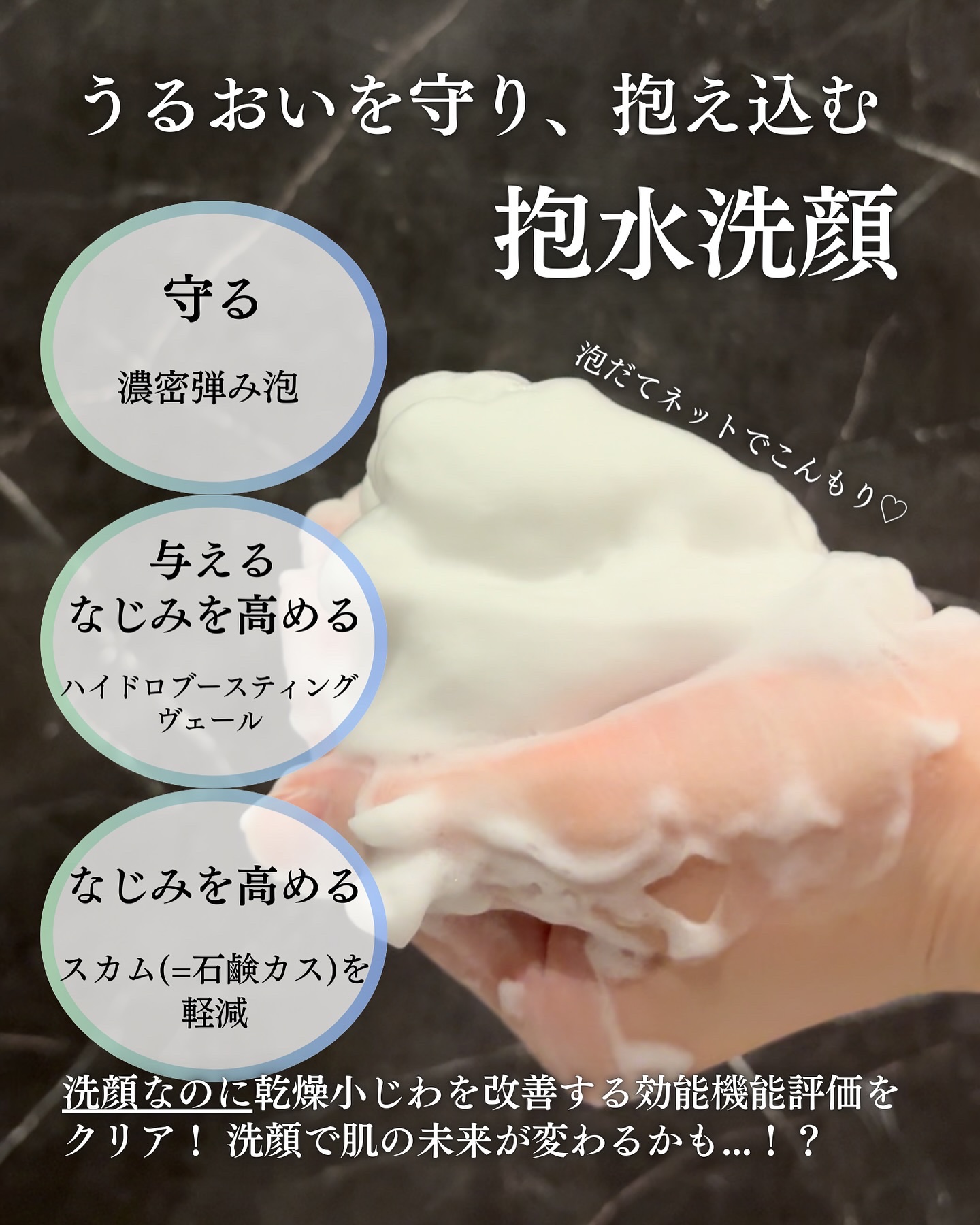 - 洗顔で素肌を解き放ち、美しさは次のステージへ 。 濃密弾み泡で包む抱水美容液洗顔が、うるおいを抱え込み、美しさを高める。 ・肌本来の美しさを引き出す抱水美容液洗顔。 使い続けるたびに、うるおってキメ細かく、明るい肌 へと導きます。 ・「密度」「泡の量」「弾力」「泡切れ」にこだわって設計された、手が肌に直接触れない洗い方を叶える濃密弾み泡。 ・乾燥による小じわを目立たなくします。 ※効能評価試験済み ・美容液成分(保湿)「コンフォートストレッチィハイドレーター※」を糸を引くほど贅沢に配合。 ・洗い上がりには、ハイドロブースティングヴェールが肌を包み、うるおいを与え、乾燥を防ぐ角層の働きを補います。 ・洗浄力とやさしさを両立させた濃密弾み泡が、乾燥から肌を守るバリア機能を保護しながら、汚れを自動吸引し、くすみの気にならない明るい肌へ洗い上げます。 ・すすぎ後、肌に残留するスカム(石鹸カス)を軽減することで、後に使用するスキンケアのなじみのよい肌へと導きます。 ※ポリクオタニウム-51、PEG-400、ポリクオタニウム-7、PEG-180、ポリグリセリル -4ラウリルエーテル 茶花の香り「ティートピア」をアクセントに、ミュゲとローズが織りなすフルーティーフローラルの香り。