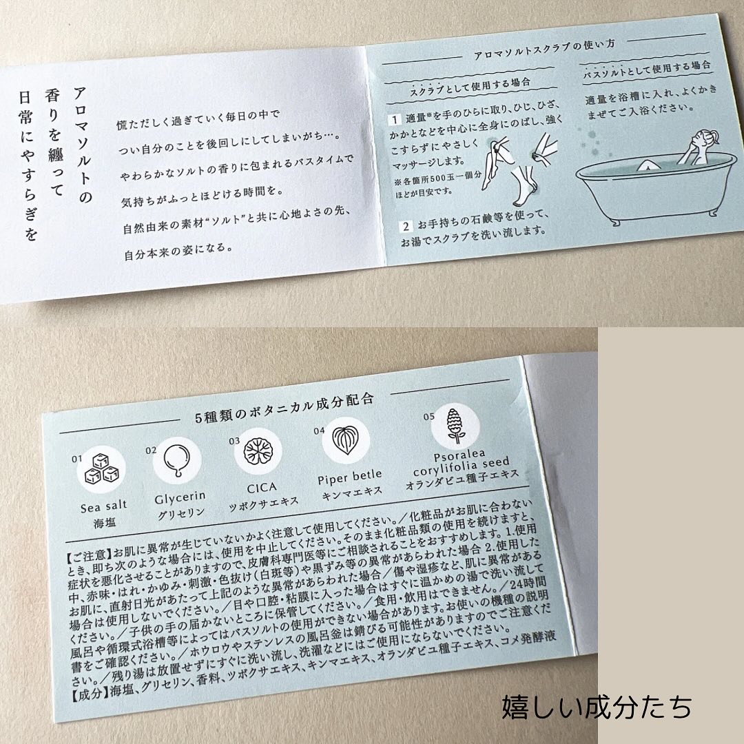 オイル層とソルト層の2層になっている珍しいタイプのソルトスクラブ。 とろ〜っとしていて、よく見るソルトスクラブとはちょっと違うよね! 優しく&しっかりスクラブで身体をケアしてそのまま湯船に!半身浴すると、じんわ〜りとスクラブが溶け出してお肌めちゃんこなめらか✨✨ 天然のアロマの香りがとーっても上品でほのかで、マインドフルネス〜🧘って感じ✨✨