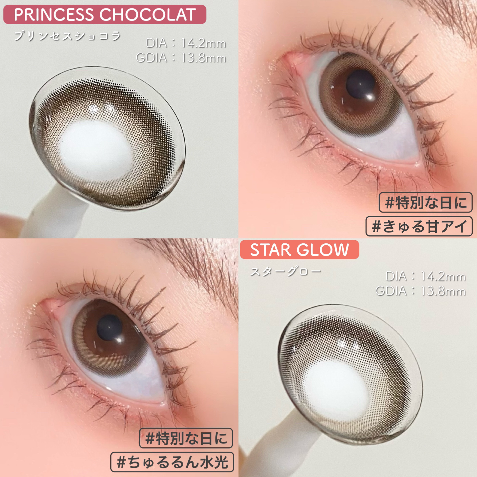 - ※2025年6月以降、商品パッケージ裏面・側面の一部表記を順次変更いたします。尚、これにかかる商品の交換・返品は承っておりません。 ヒロインの瞳の法則♡ ナチュラルなのにしっかり盛れるDIA14.5mm! ■ヒロインブラウン 透明感たっぷりなブラウンレンズ。瞳に馴染む色だからとってもナチュラル。 ■アイドルリング さりげない細フチとちゅるんブラウンがナチュラルに瞳を強調♡ ■ライアーピンク ピンクブラウンのフチとムラのあるデザインで立体感のあるきらきらな瞳を演出♡ ■レディブラック じゅわっとぼかした繊細なデザインで透明感に満ちた存在感のある瞳を演出♡ ■プリンセスショコラ しっかり太フチとあまくとろけるショコラブラウンでプリンセスみたいに愛される瞳に♡ ■スターグロー くりっと盛れる太フチとうるみツヤめく水光カラーで光を取りこむキラツヤな瞳に♡ ■Maria Ring(マリアリング) 絶妙細フチと白っぽ透明感グレージュでちょっぴり背伸びした余裕仕込みレンズ♡ ■Mermaid Ring(マーメイドリング) 絶妙太フチときらめき透明感マーメイドグレーでピュアにうるめく美少女な瞳に♡ カラーコンタクトレンズの不適正使用による眼障害の危険性等などがあります。 ●コンタクトレンズは高度管理医療機器です。不十分な洗浄・消毒など不適切なケアや、長時間・交換期間を超えた装用により、アレルギー性結膜炎、角膜感染症、角膜潰瘍等の重篤な眼障害が発生する危険性があります ●ご使用前に取扱説明書を確認してください 使用上の留意事項 ●眼科医院等を受診してからお求めください ●眼に異常を感じたら直ちにレンズ使用を中止し、お近くの眼科等で診察を受けてください ●医師の指示にしたがってご使用ください ●コンタクトレンズを装用する場合、自覚症状がなくても、眼科医院等での定期検査を受けてください ●レンズに不具合がある場合は使用しないでください