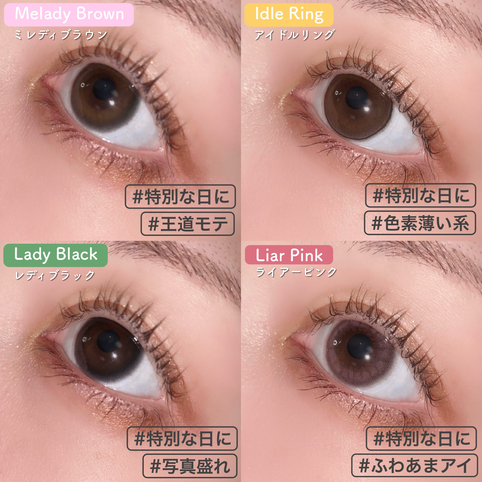 \既存色3色がマンスリーになって登場🎀/.melady¥1400(税抜)/2枚.DIA14.5mm着色直径13.8mmBC8.6mm含水率38%着画:マンスリーレンズ▪️アイドルリング細フチ×ちゅるんブラウン少しくすみも感じるようなナチュラル...