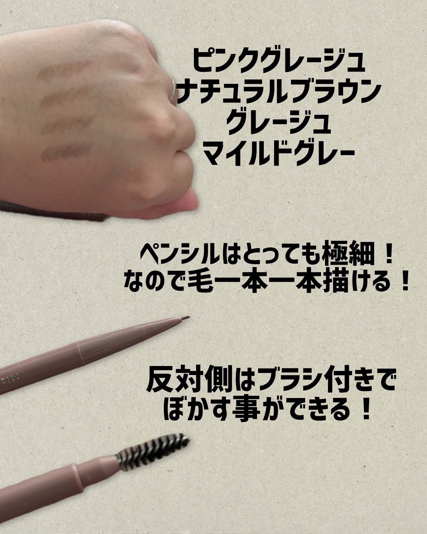上手く描けないことが多い眉毛に救世主! スキューズミーMisel Ady パウダリーアイブロウペンシルスリム 最細0.84mm!! 折れやすく硬めの芯なので少しだけ繰り出して描くと毛並みも色づきも綺麗になります😍 カラバリ豊富で選びやすい! 少しずつ重ねて調整していくと綺麗に描けます😍