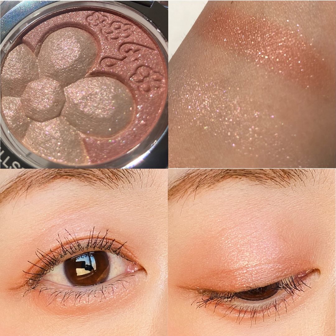 マットは肌に溶け込むような粉質でボソボソしません! シマーのしっとりした粉質も密着してくれて好き!!! 1番キラキラなのは右上のラメですね🍑💓でも粒が大きくないので、大人も使いやすいラメだと思います🥰 どの色使おうか迷うけど、どれ使っても本当可愛くて、自分が桃になったかのような🍑(笑)多幸感あふれるパレットです💘