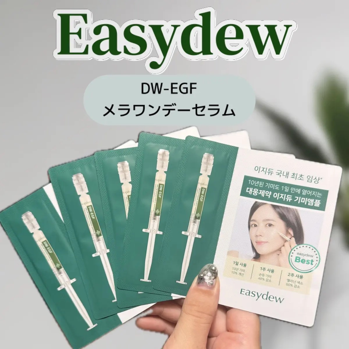 韓国を代表とする製薬会社が展開するシミ専門ドクターズコスメ・イージーデュー。独自開発のEGF成分及びトラネキサム酸、ナイアシンアミド、ビタミンC誘導体含有。美白効果が証明されている商品とか。 「イージーデュー DW-EGF メラワンデーセラム」韓国国内でまもなく2,000万本突破の大ヒット商品で、たった1週間でシミが48%減少し、2週間でメラニン色素が60%減少…と、ありますが。 でもコツコツと。何もしないのが一番良くないこと。