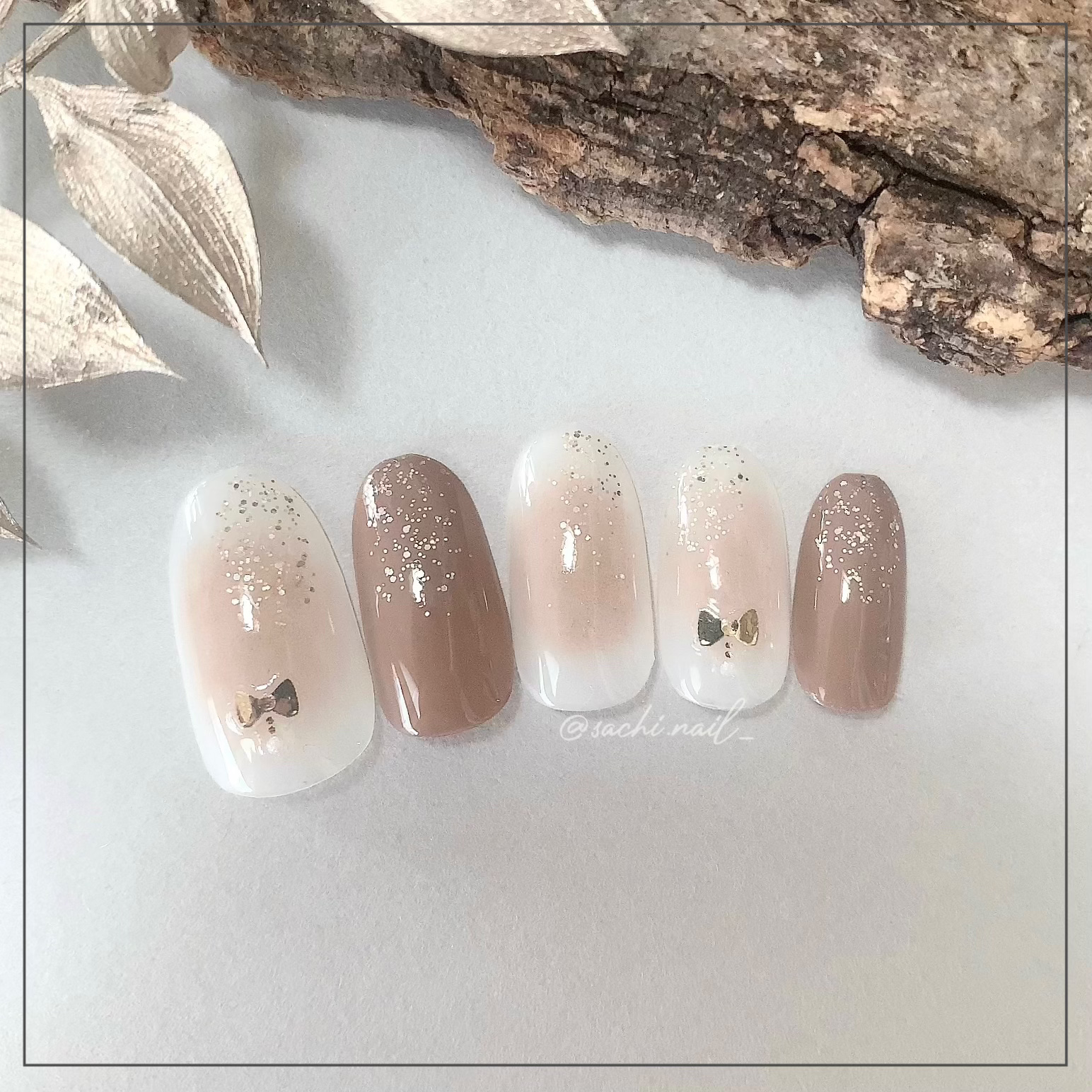 ワンカラーでも指ごとに色を変えるだけでオシャレに見えます💕 画像のようにゴールドラインとストーンを少し足すだけで華やかさがアップ🥰 何度かご紹介したことのあるスポンジで作るグラデーションです✨ スポンジを使うことで境目が綺麗に馴染んでくれます💕 アルミホイルの上でブラウンとトップコートを1:1くらいで混ぜたものを、トップコートのハケに取って3箇所に塗るだけ👌 事前に混ぜたものを塗ることで、爪の上でぼかすより簡単に出来ます💕 ベースカラーが乾く前に点置きしてぼかすことで綺麗にぼかせます✨ スピードが大事なので、使うポリッシュのキャップは全て開けておきましょう😊 天然石のラインはガタガタの方がより天然石っぽく見えるので、ラインを描くのが苦手な方でも大丈夫🙆♀️ 難しそうに見えて、やってみると意外と簡単に出来ます♡
