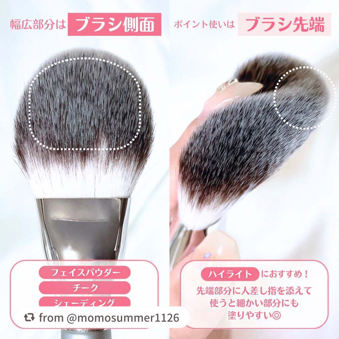 - 肌あたりなめらか、ふわっと自然に塗布できる全パウダーに対応するブラシ。 たっぷりの毛量が肌にやさしく沿って、顔の幅広面、骨格ラインにフィットする、塗りやすいファン(うちわ)型。保管や持ち運びにも嬉しいソフトカバー付き。 ●POINT● ブラシ側面:フェイスパウダー(プレスト/ルース)、チークパウダー、シェーディングパウダーにオススメ♬ ブラシ先端:ハイライト、ポイント使いに♬ブラシ部分にひと差し指を添え、薄い状態を固定すると細かい部分も塗りやすい!