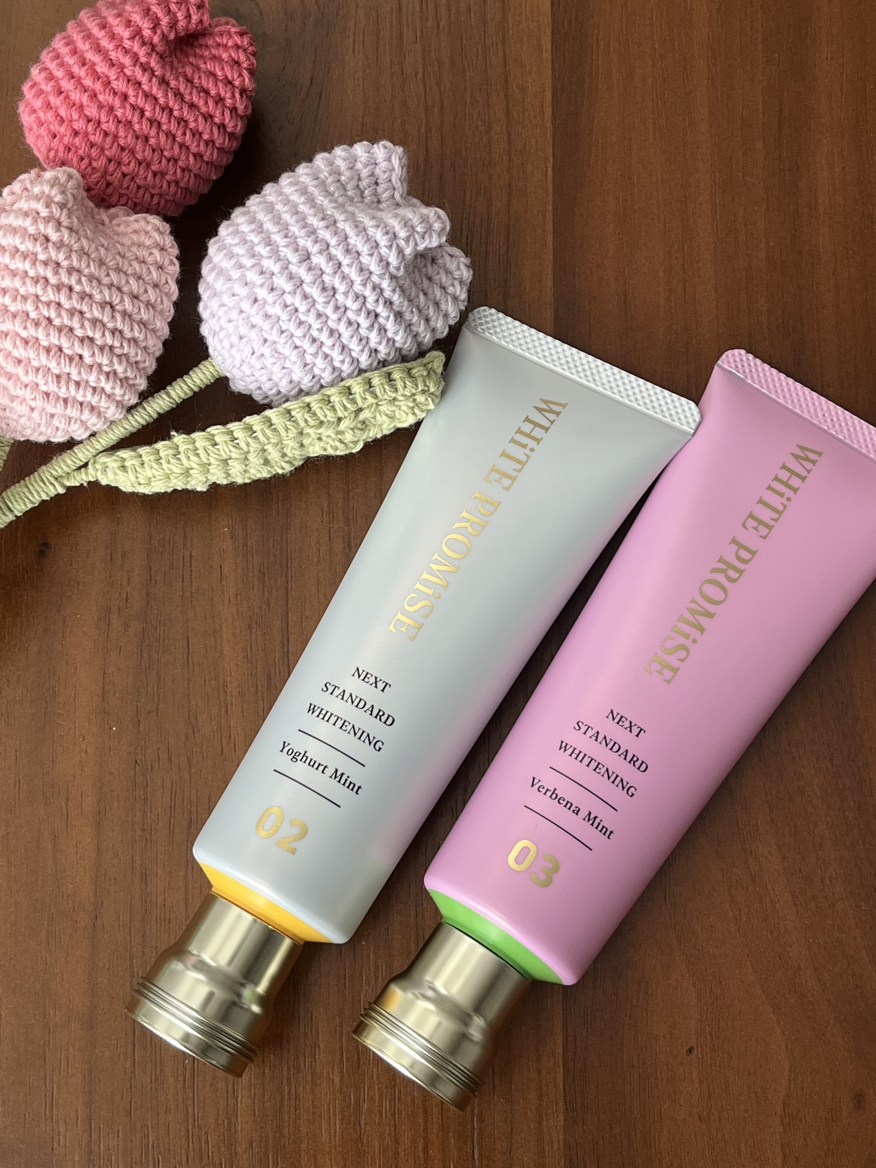 WHiTEPROMiSE#02ヨーグルトミント、#03ヴァーベナミントを使用しました。今までにない、”新”美容液発想の美白*歯みがき。ビタミンC*1・コラーゲン*2・NMN*3など、美容液成分が配合されているという、美白*美容液発想の新感覚歯...