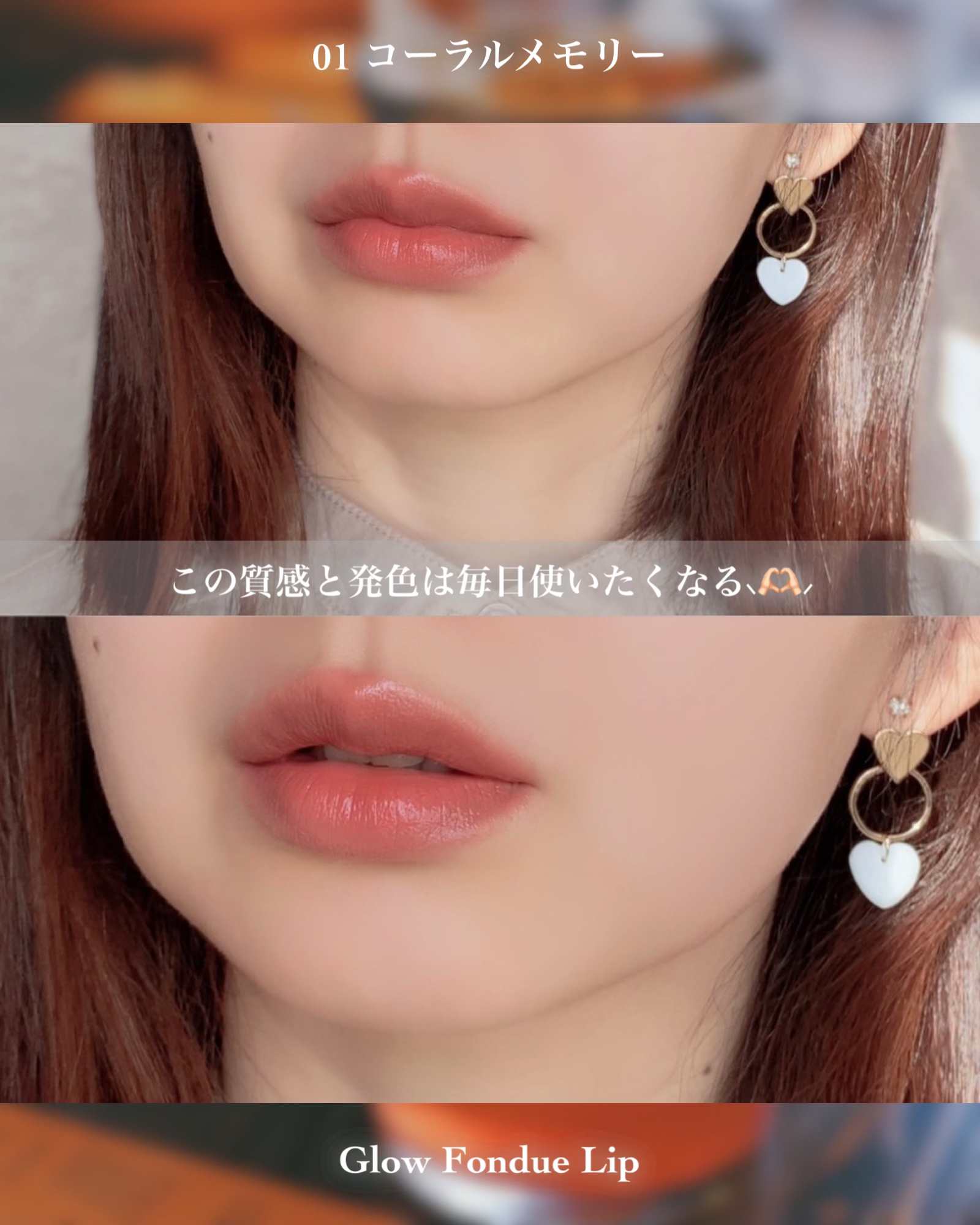- とろける濃密ツヤ膜プランパー※リップ。※メイクアップ効果 とろけるような柔らかい質感の美発色×濃密ツヤ×うるおいツヤ膜リップ。 唇にピタッと密着し、色ツヤが持続。 プランパー効果でぷるんとボリュームアップと縦ジワを補正。(メイクアップ効果) 美容保湿成分(マカデミア種子油、オリーブ果実油、パルミチン酸レチノール、ハチミツ、ヒアルロン酸Na)配合。 清涼感のある使い心地。 01 コーラルメモリー:肌なじみの良いニュートラルな溶け込みコーラルピンクカラー。 02 レイジーローズ:明るすぎず暗すぎない曖昧ローズカラー。 ※使用上の注意 唇に異常が生じていないかよく注意して使用してください。唇に異常が現れた際はご使用をおやめください。 大変柔らかい中身のため1mm以上(半周以上)繰り出さないでください。 使用時は強く押し付けず、優しく塗布してください。ご使用後は、半周程度(繰り出した分)繰り戻し、キャップをしっかりしめてください。 繰り出し過ぎや繰り戻し過ぎ、落下等の衝撃により中身が折れたり、繰り戻らなくなる可能性があります。高温あるいは温度変化の激しい場所では保管しないようにご注意ください。